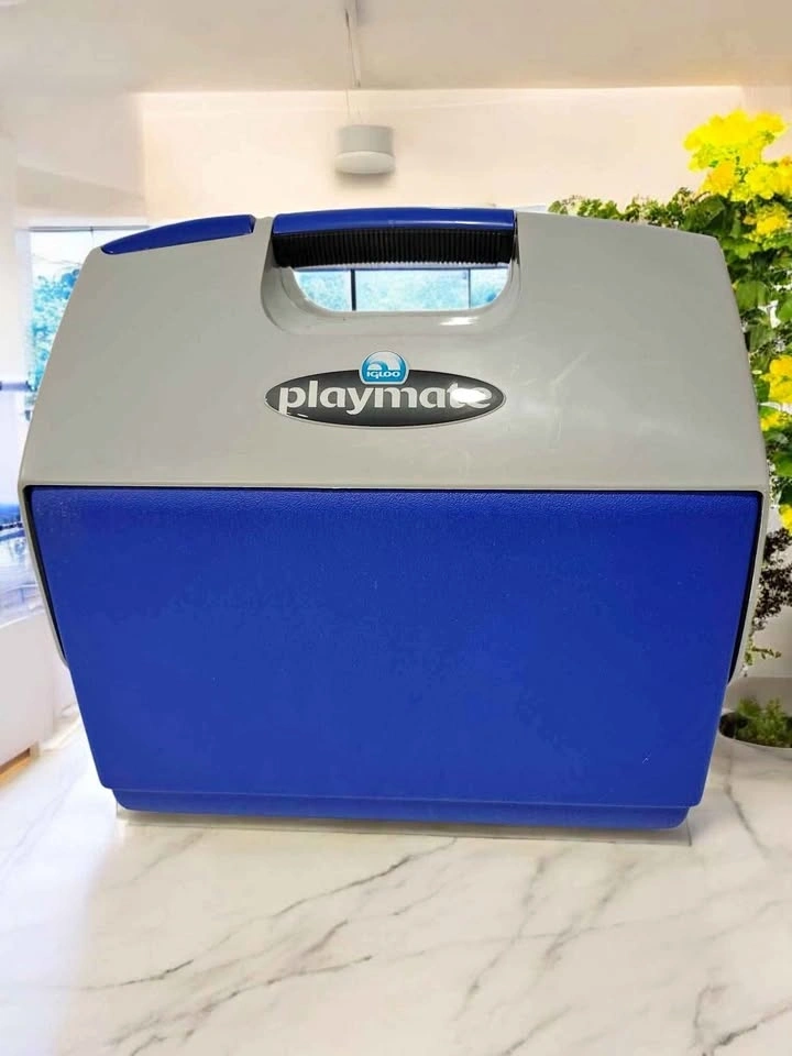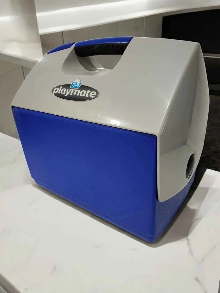 Bring food and beverages to the beach, park or woods in this Igloo Playmate cooler. Its generous 15 litre capacity fits treats and supplies for the whole family. The unique tent top design features a secure lid that prevents spills and is easy to operate with only one hand. We paid $70 after tax a few years ago and have only used it a few times, so it looks like new. The 15L capacity is ideal for lunch. Features a soft grip handle for carrying comfort, a trademarked tent-top design with a secure lid that helps prevent spills, and a push-button lid design for convenient one-handed operation. The lid swings open to either side for easy access to contents. Stain- and odour-resistant liner. Capacity: 15 liters. Product Dimensions: 25.9D x 40.3W x 37.8H Centimetres.