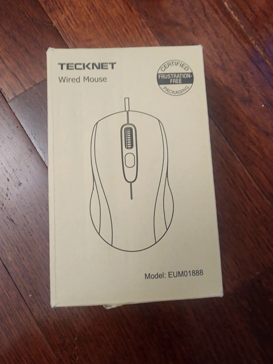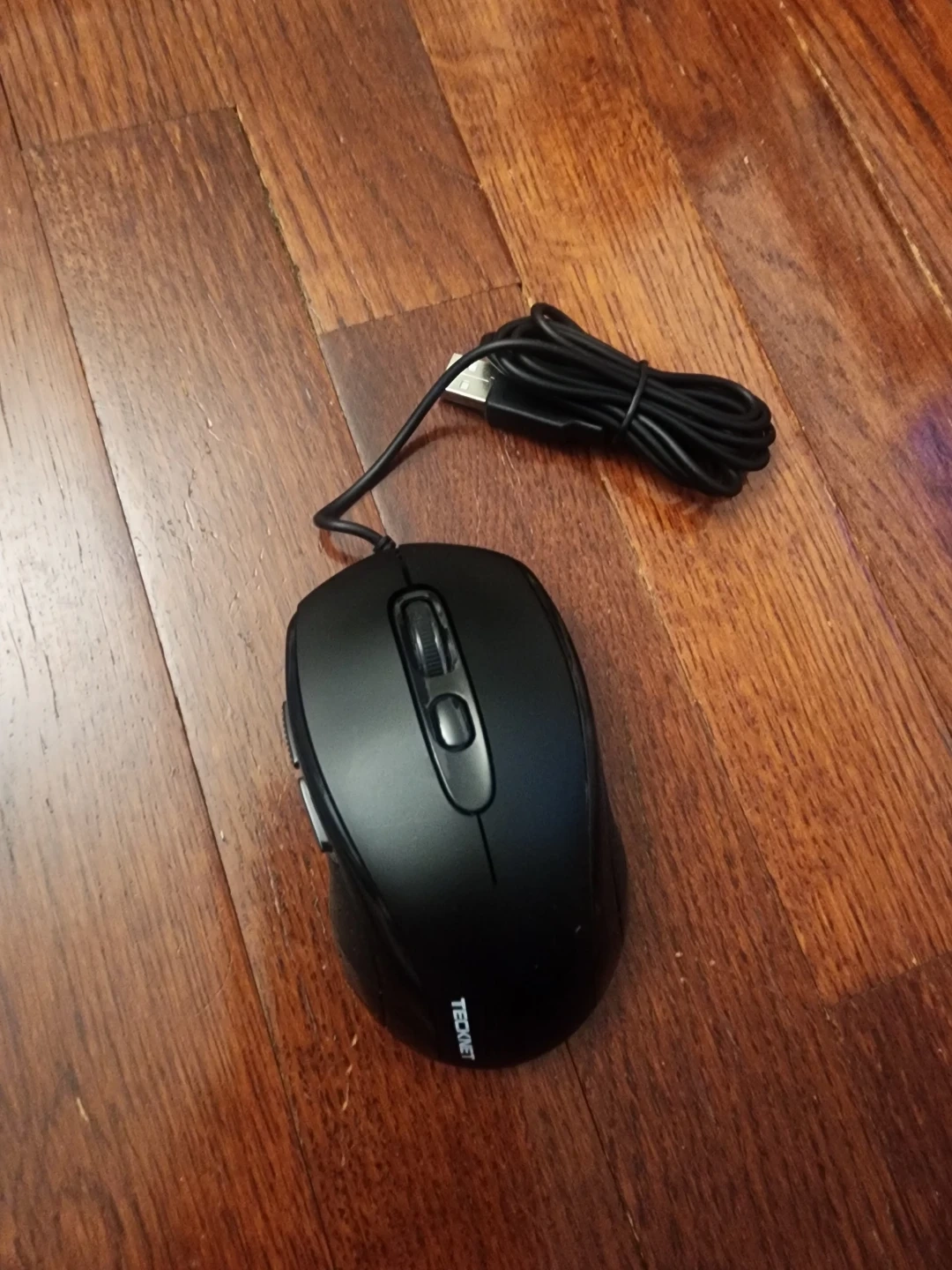 This is a TECKNET wired mouse. It's black and has a scroll wheel and three buttons. Model EUM01888.