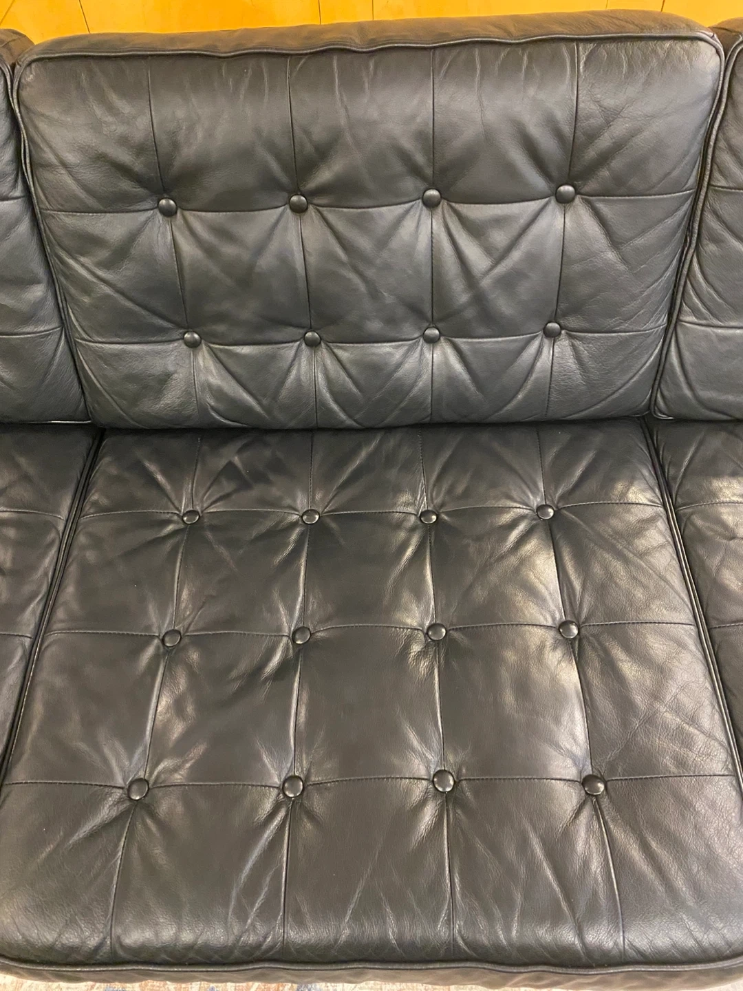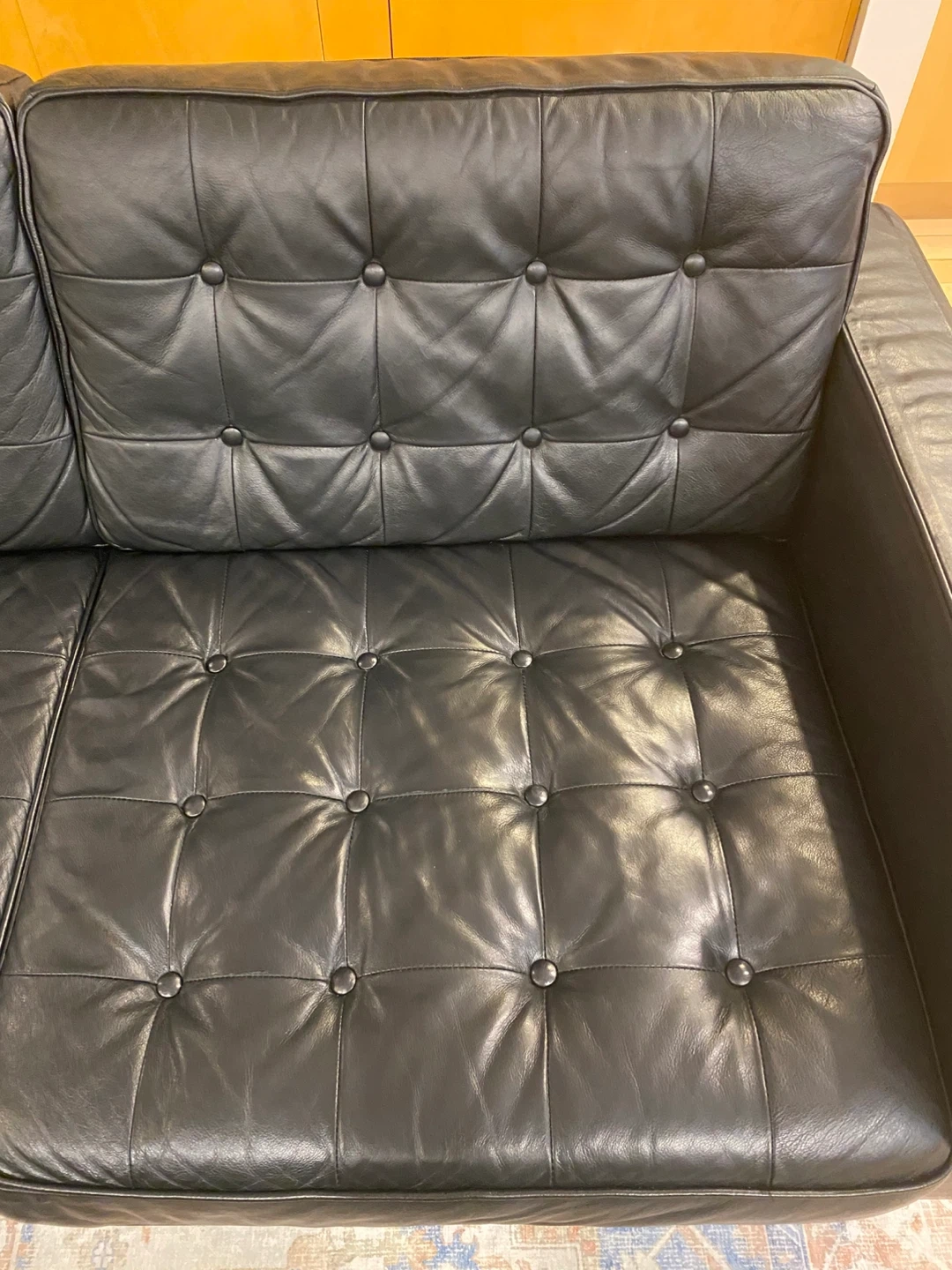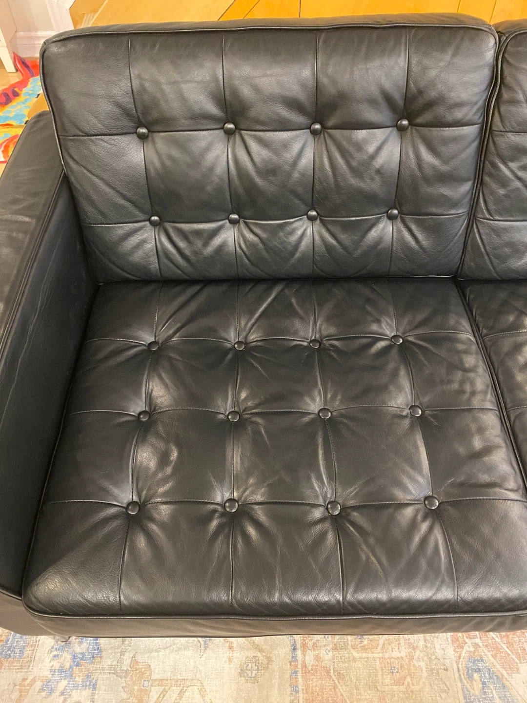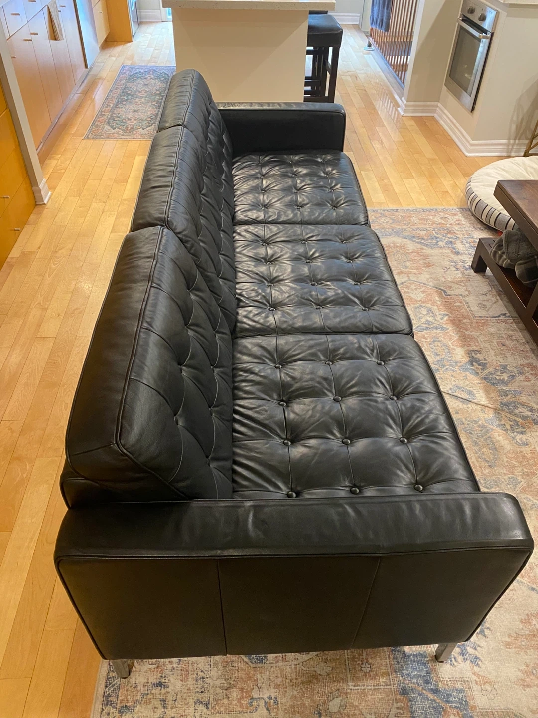 80EQ3 Reverie black leather 3-seater couch in excellent used condition. Originally purchased for $5,000 and well taken care of (please see pictures for wear in one tiny section). Ideal for a home office, staging, or small space living area! Comes in handy as an extra guest bed too, as it is long and quite comfy. Very solid, VERY heavy. Comes from a cat-free and smoke-free home in the east end of Toronto (Danforth and Donlands). Pick up only, and truck required as it will not fit in a standard SUV. Open to REASONABLE offers and looking to sell ASAP because new couch is arriving. Dimensions: 34” Wide 32.5” Tall 24.5” Arm Height 92” Long Link to original couch here (black no longer available): https://www.eq3.com/ca/en/product/cmdomf9v203o5356nvjaa01m5/living/seating/sofas/reverie-sofa-online-exclusive?cmdiyi1zc07z4356npsjy6y2s=cmdiyr4ia0avx356n7heszmho&cmdiyr9o60aym356nq7hzwkoj=cmdiys9i60bn1356n3q9usv5z&cmdiysmsr0c1m356nwz4hz62x=cmdj0pd7n0ihj356nnmwx4s81