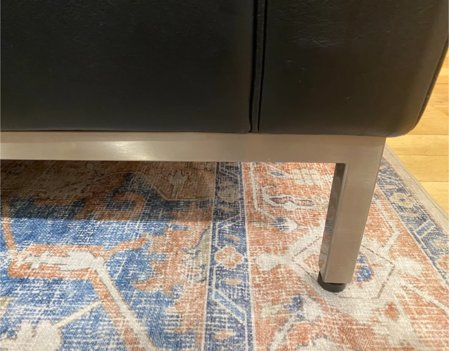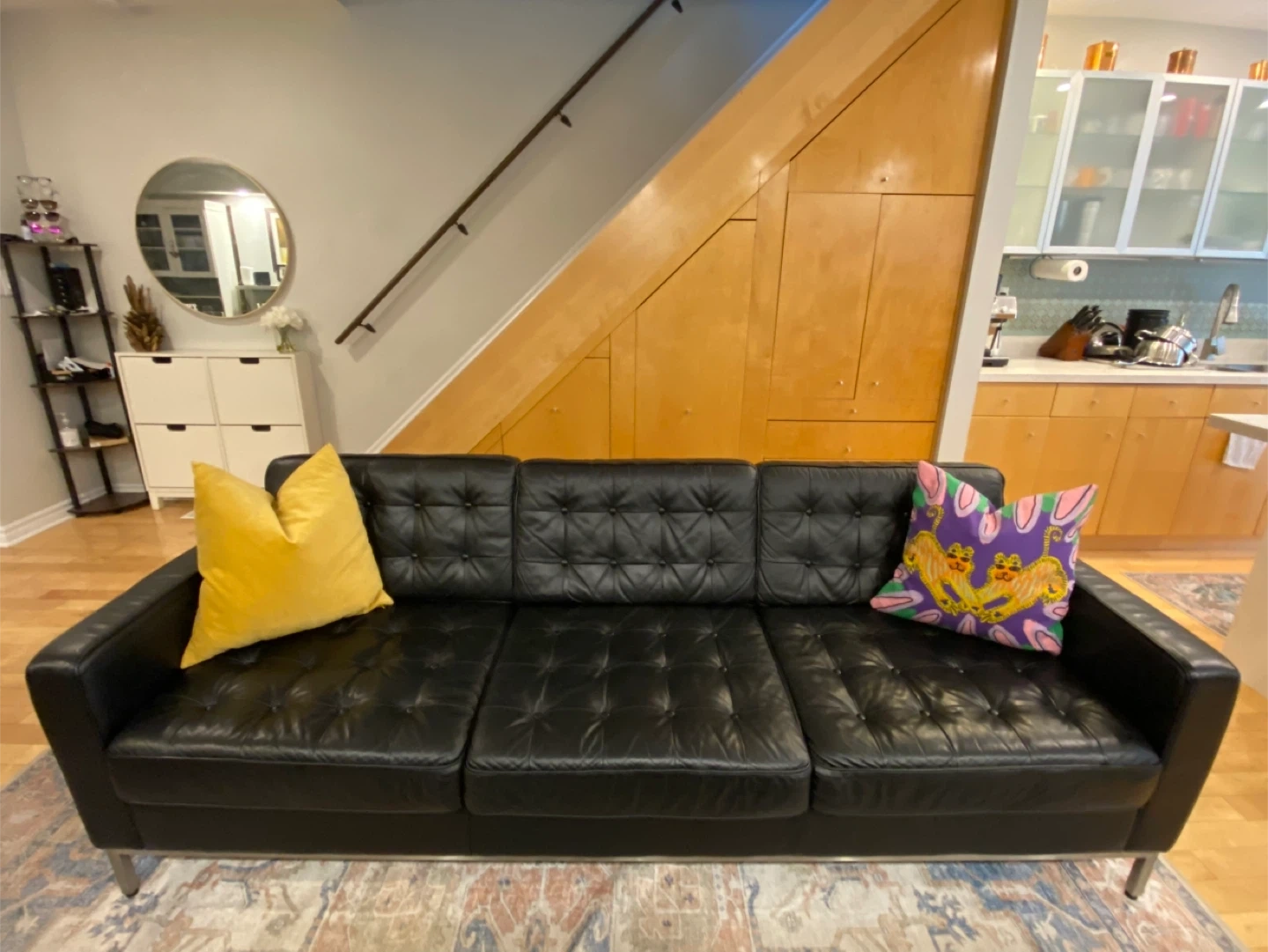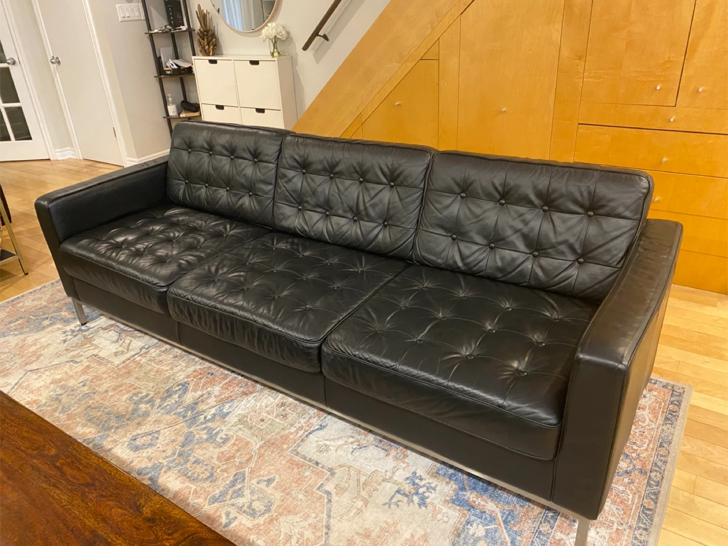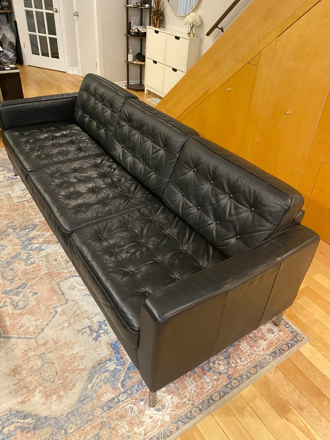 80EQ3 Reverie black leather 3-seater couch in excellent used condition. Originally purchased for $5,000 and well taken care of (please see pictures for wear in one tiny section). Ideal for a home office, staging, or small space living area! Comes in handy as an extra guest bed too, as it is long and quite comfy. Very solid, VERY heavy. Comes from a cat-free and smoke-free home in the east end of Toronto (Danforth and Donlands). Pick up only, and truck required as it will not fit in a standard SUV. Open to REASONABLE offers and looking to sell ASAP because new couch is arriving. Dimensions: 34” Wide 32.5” Tall 24.5” Arm Height 92” Long Link to original couch here (black no longer available): https://www.eq3.com/ca/en/product/cmdomf9v203o5356nvjaa01m5/living/seating/sofas/reverie-sofa-online-exclusive?cmdiyi1zc07z4356npsjy6y2s=cmdiyr4ia0avx356n7heszmho&cmdiyr9o60aym356nq7hzwkoj=cmdiys9i60bn1356n3q9usv5z&cmdiysmsr0c1m356nwz4hz62x=cmdj0pd7n0ihj356nnmwx4s81