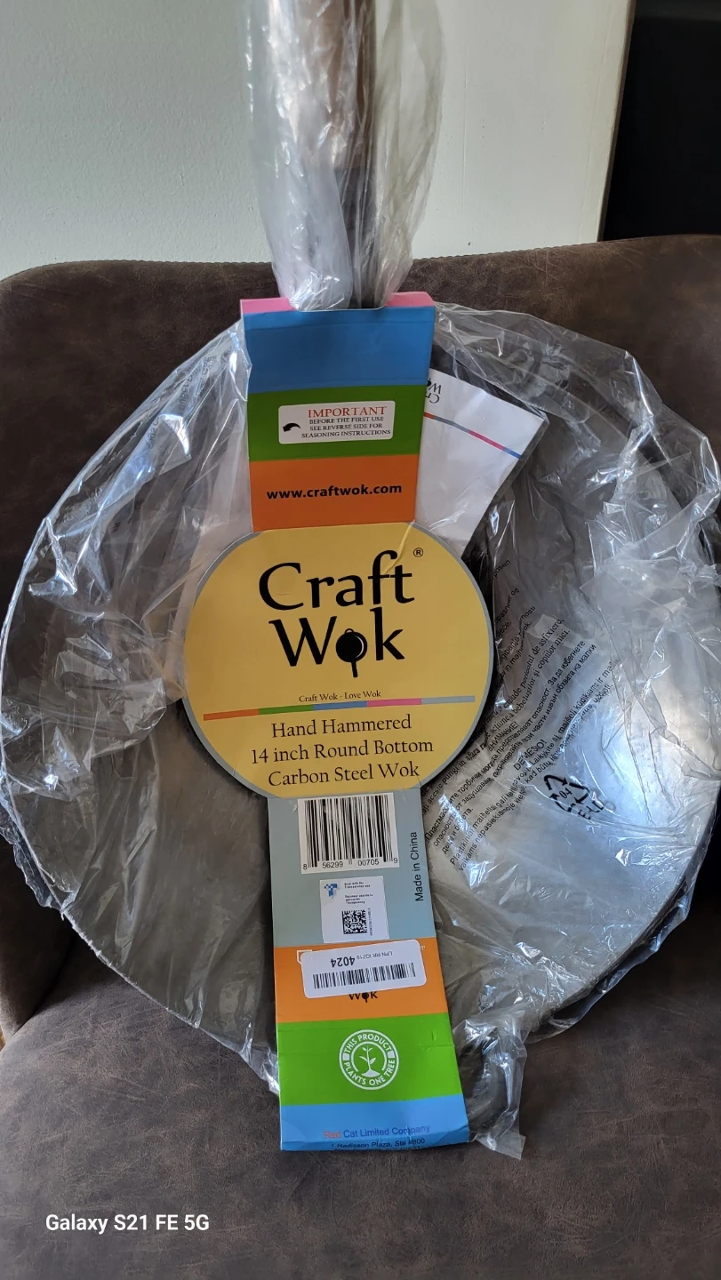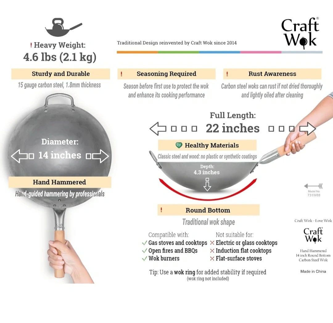 This is a hand-hammered 14-inch round bottom carbon steel wok. It's 1.8mm thick with a full length of 22 inches and a depth of 4.3 inches. Seasoning is required before first use to protect the wok and enhance its cooking performance. It's compatible with gas stoves, electric or glass cooktops, open fires, BBQs, and wok burners.