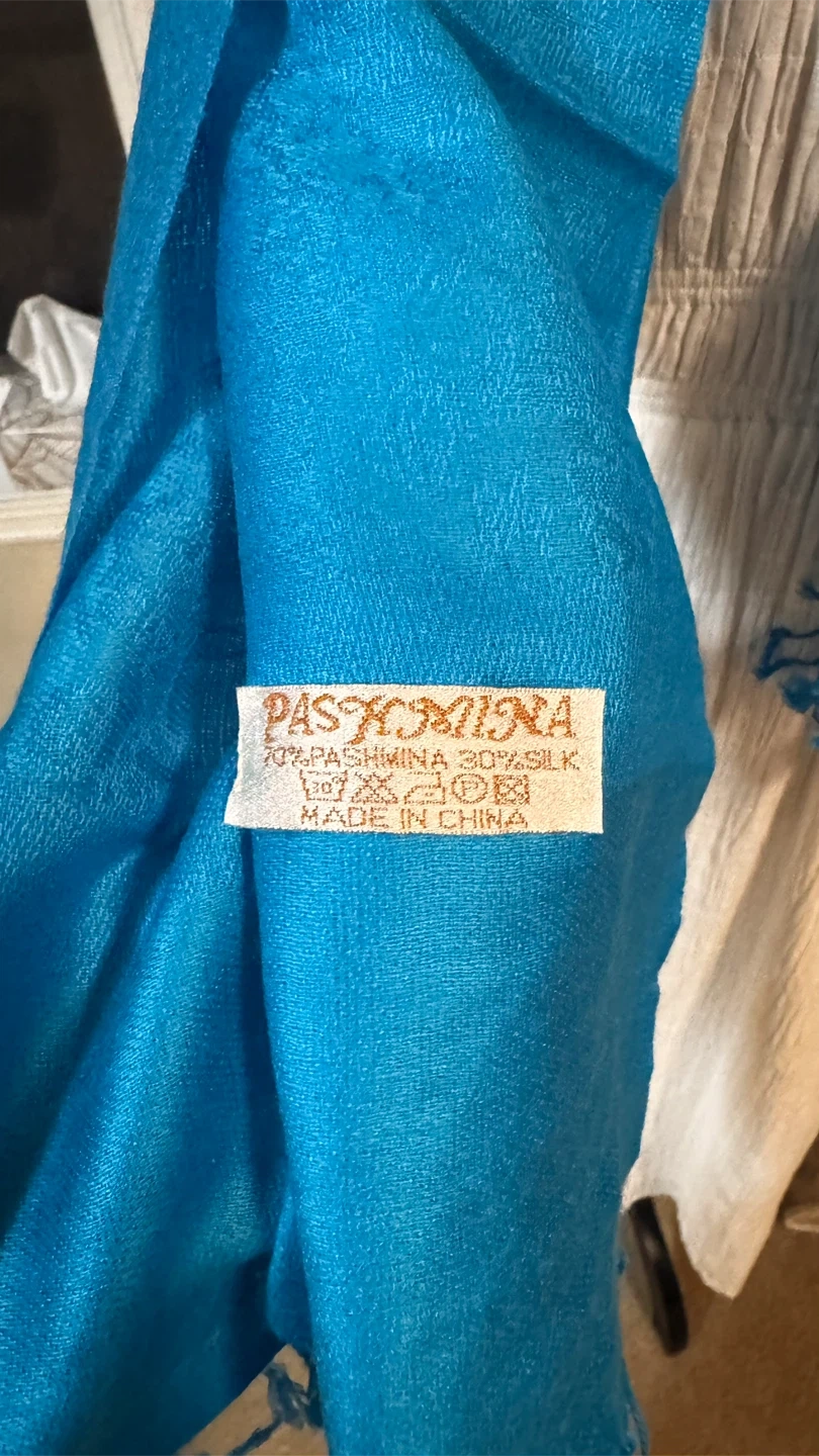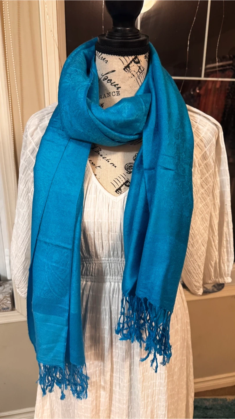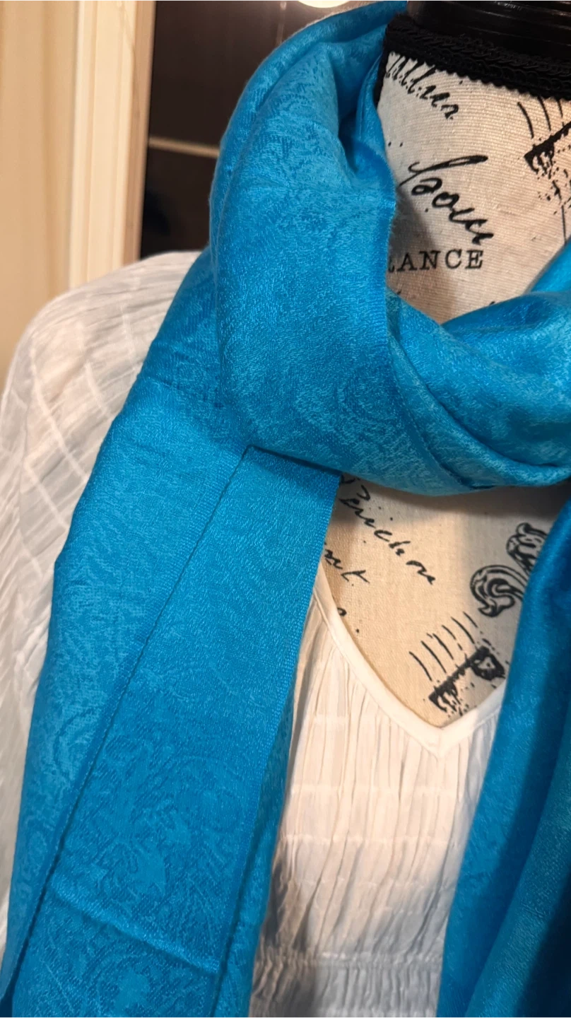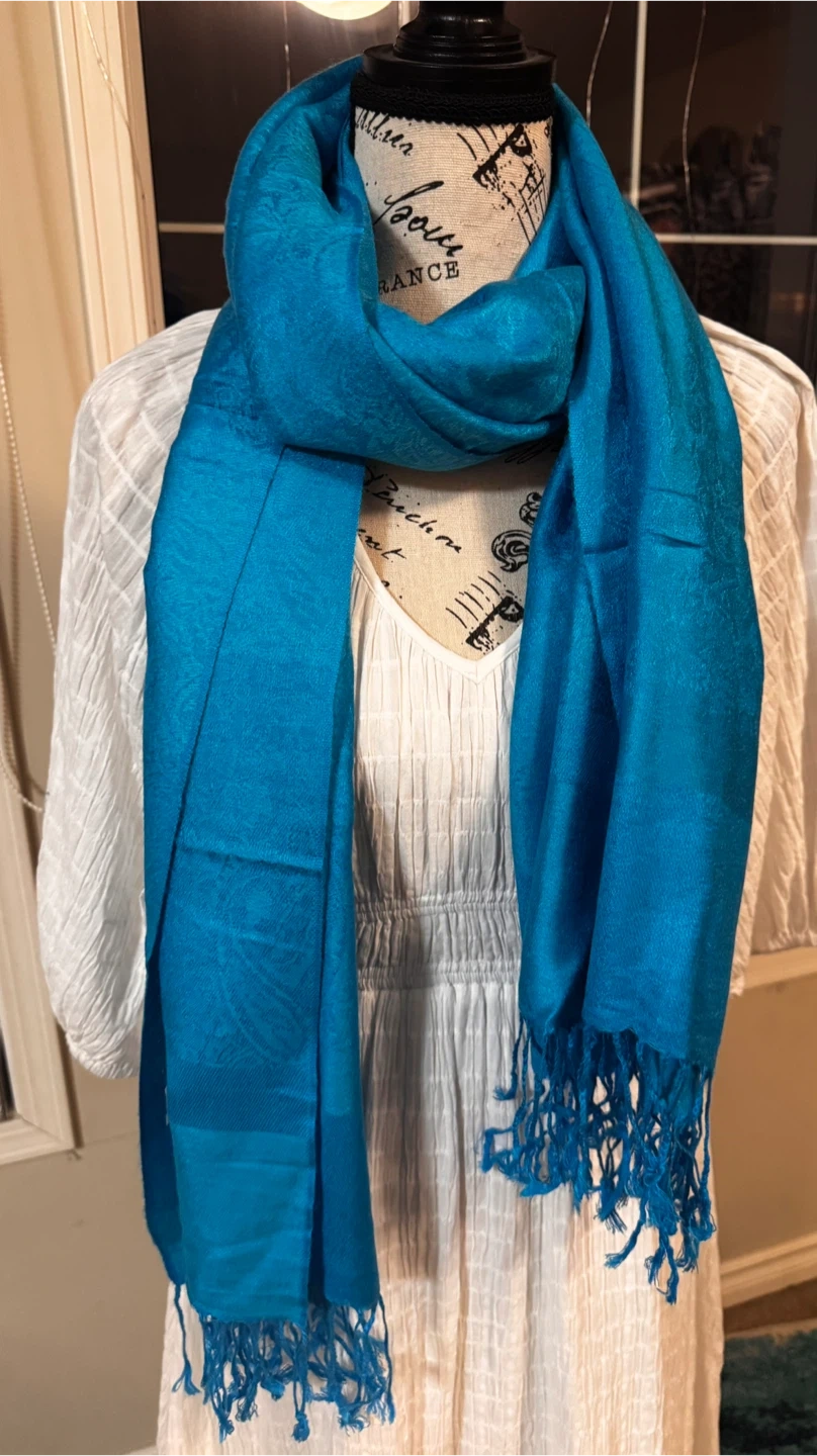 A beautiful teal pashmina scarf. It's made of 70% pashmina and 30% silk. The scarf has a lovely soft texture and is perfect for adding a pop of colour to any outfit