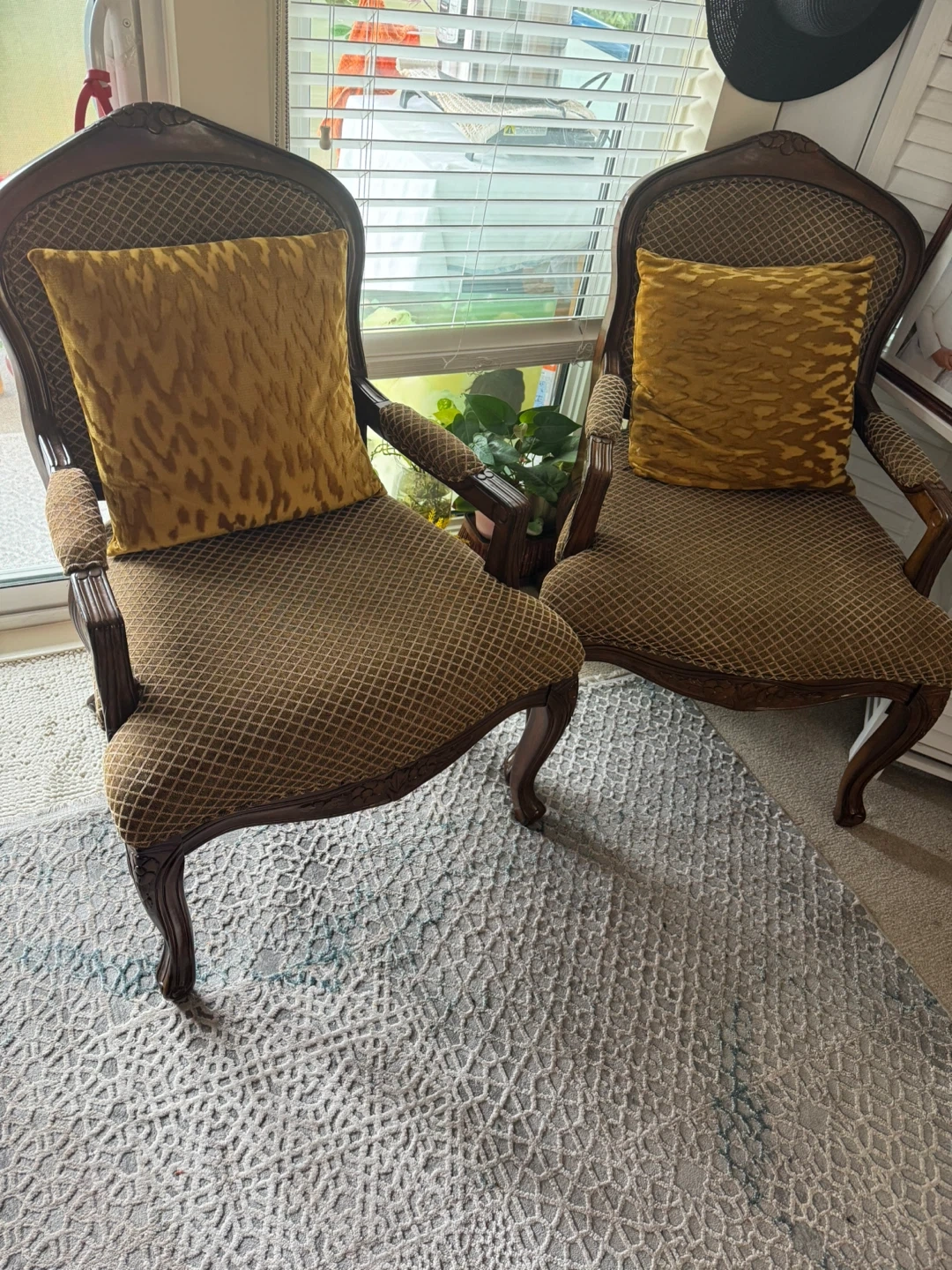 Two classic accent chairs, upholstered in a diamond-patterned fabric. Each chair includes a matching gold-toned cushion with a textured pattern. The wooden frames have an antique finish and decorative carvings. They're sturdy and elegant!