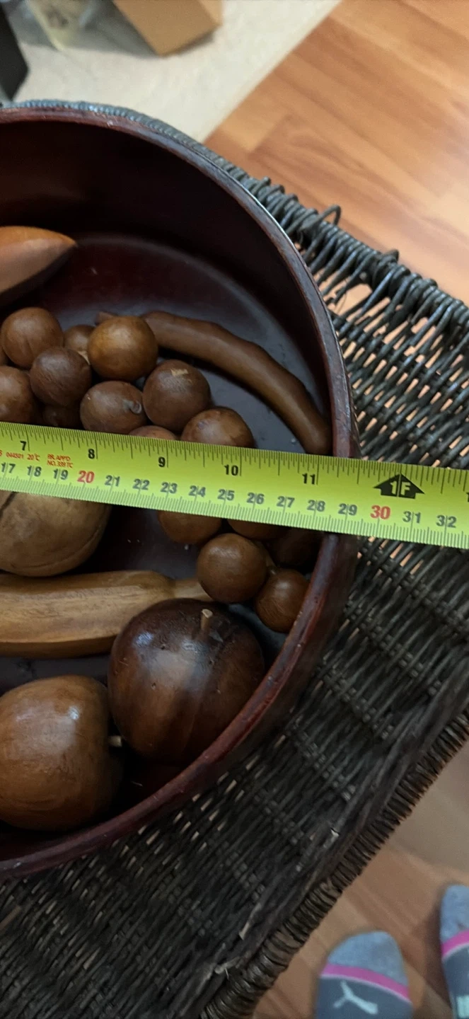 Decorative wooden bowl filled with carved fruits including bananas, grapes, and other assorted fruit shapes. The bowl measures approximately 12 inches in diameter. Adds a rustic charm to any kitchen counter or dining table!