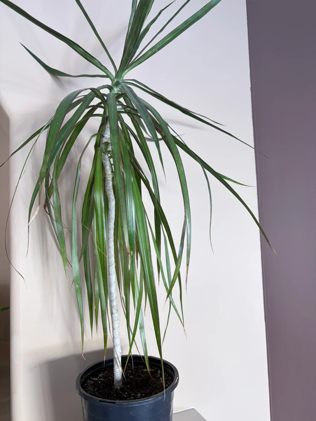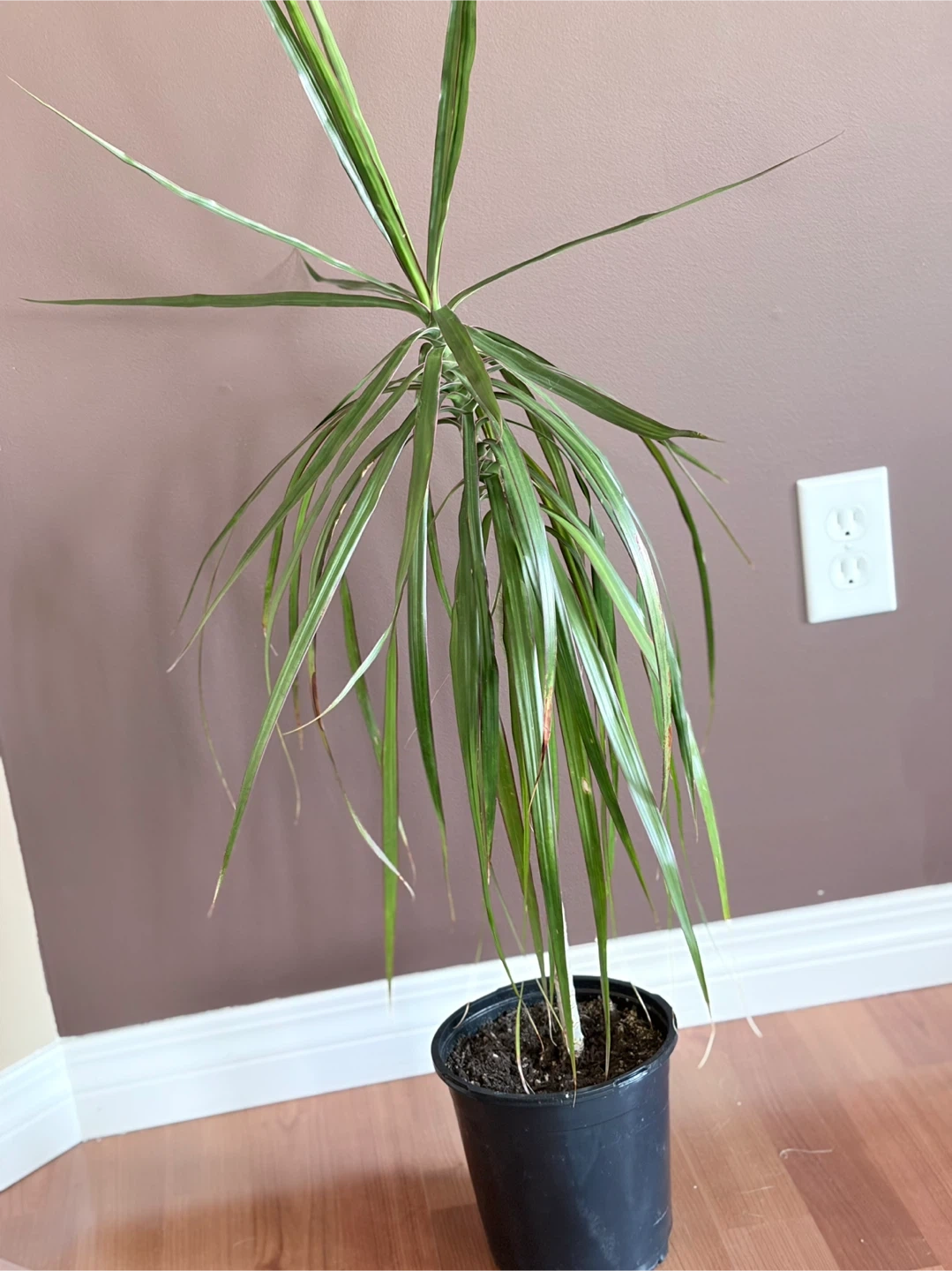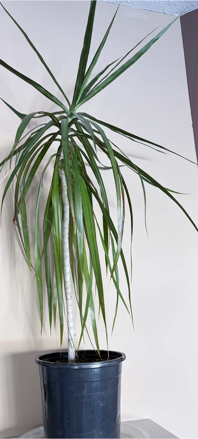 A Dracaena Fragrans 'Massangeana' plant in a black plastic pot. It's 3’ tall with pot. The actual plant is 29” tall. Some leaves are browned, it’s been too close to heat register and my cat loves to play with the leaves. browning. Transplanted to current pot last summer. Pot is 7” across. Healthy, just needs a better home. It's a low-maintenance choice for adding greenery to your space!