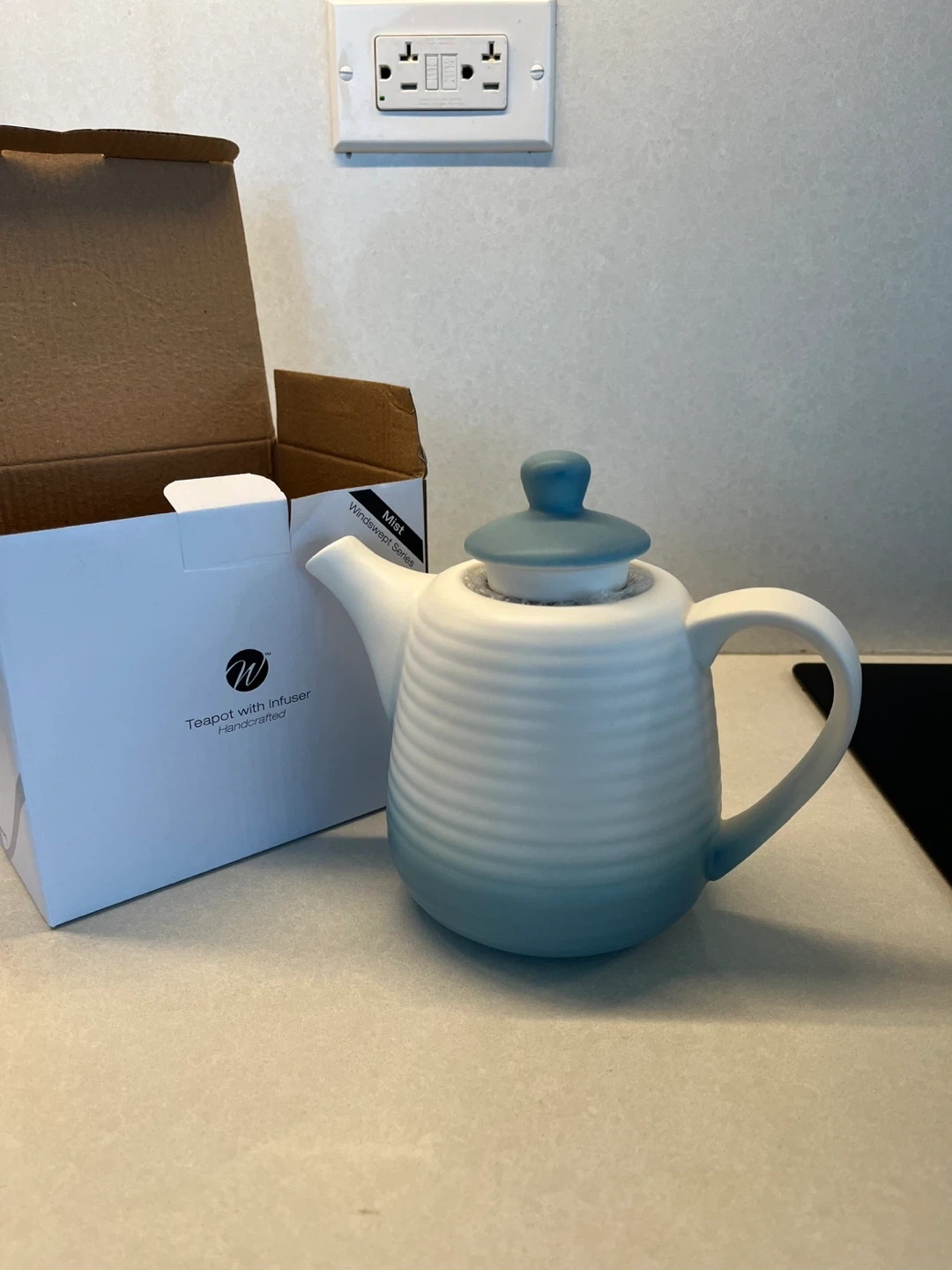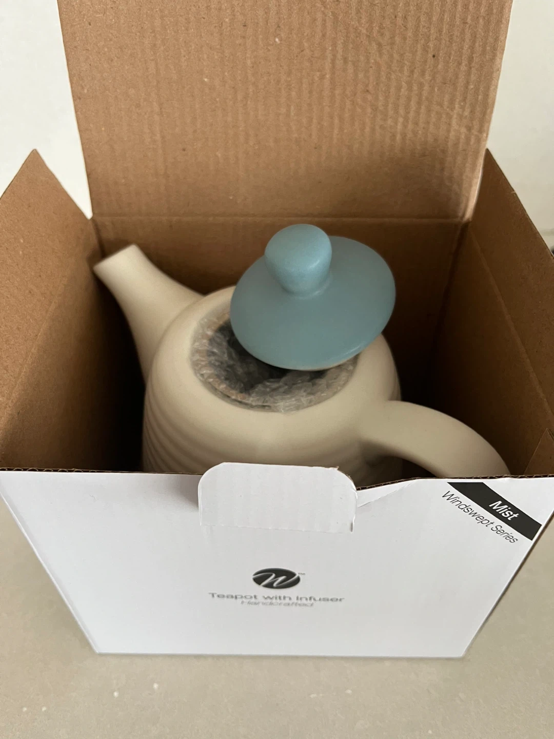 A new teapot with infuser from the Windswept Series, in the "Mist" colour. It's handcrafted ceramic and includes the lid. Perfect for brewing your favourite loose-leaf tea!