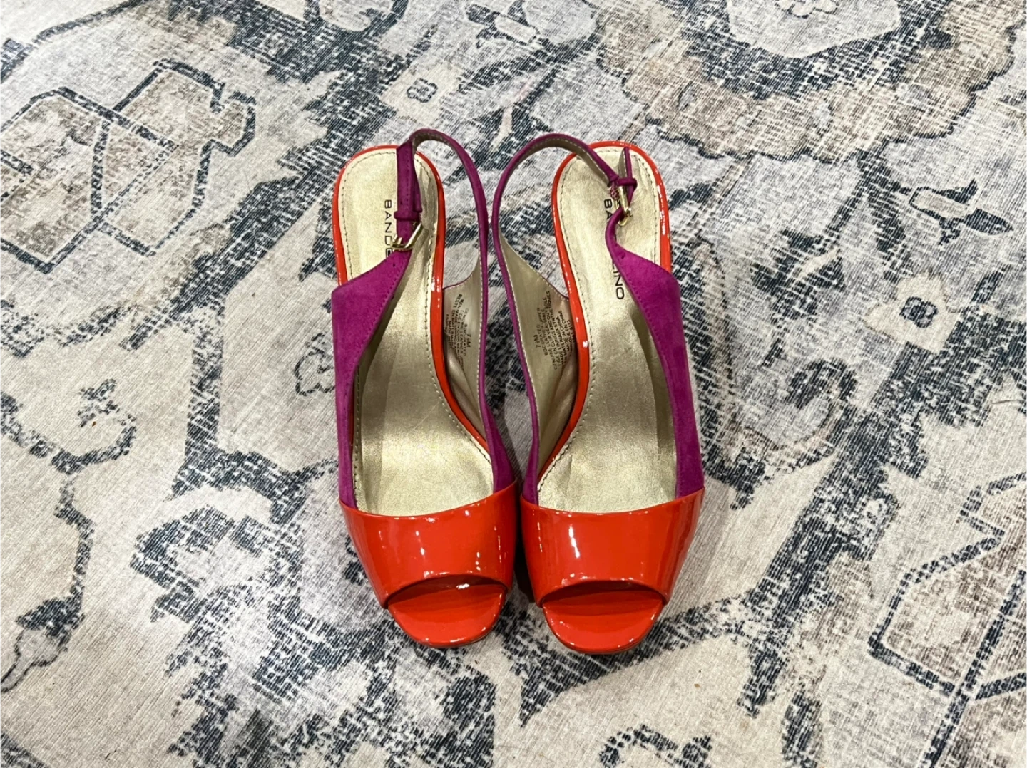 These Bandolino slingback heels come in a vibrant orange and pink colour combo. They're a size 7 medium, with a patent toe and suede straps. Includes original box!