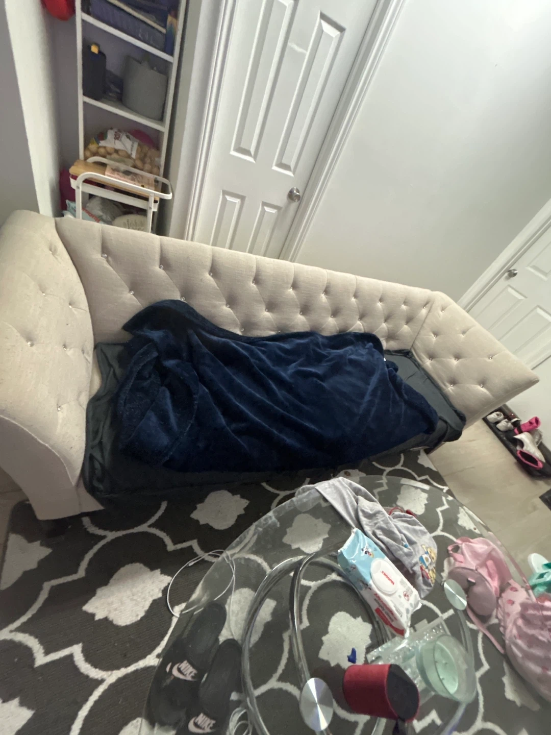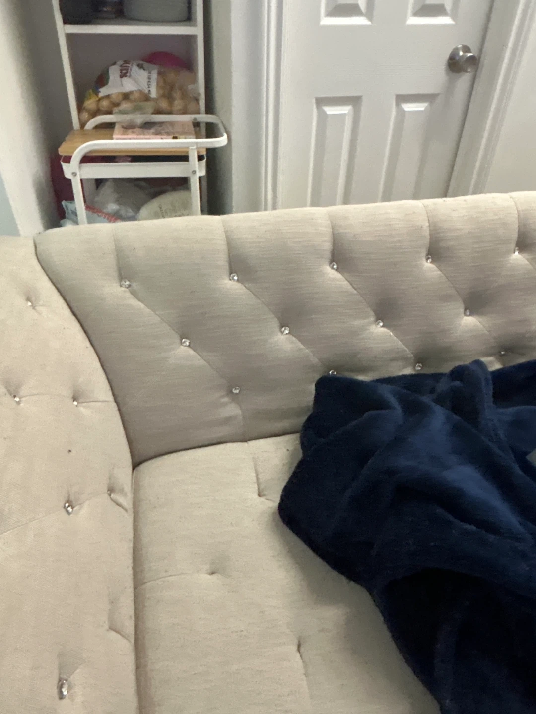 Tufted Beige Sofa with Crystal Accents