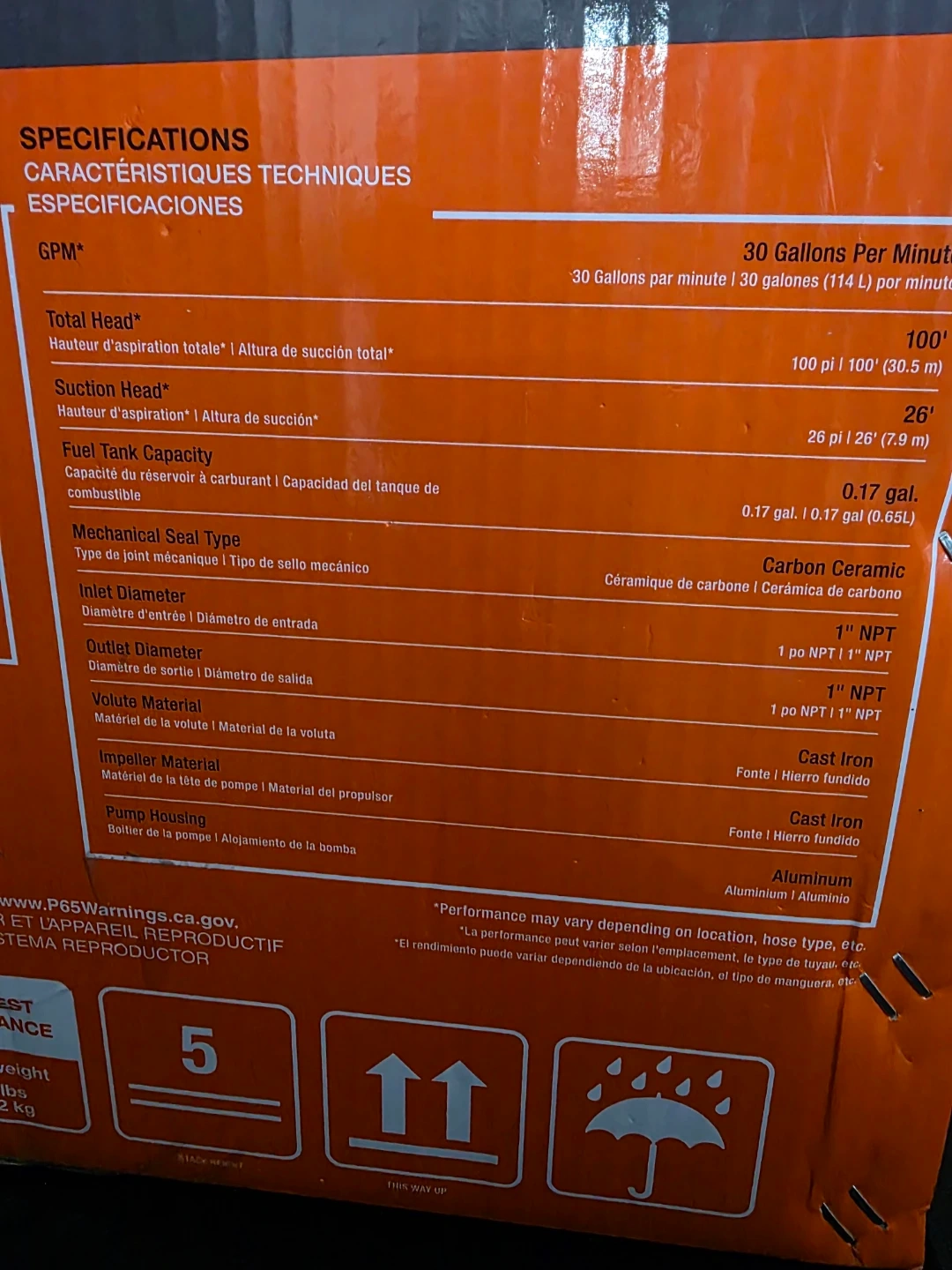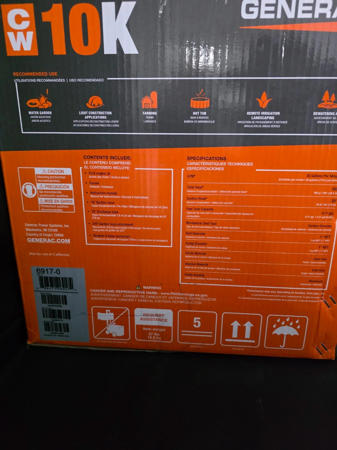 This Generac water pump delivers 30 GPM (114 L per minute). It features a 1" NPT inlet and outlet. Includes a 10' suction hose and a 25' discharge hose. Brand new in sealed box. Asking 260.00 firm.