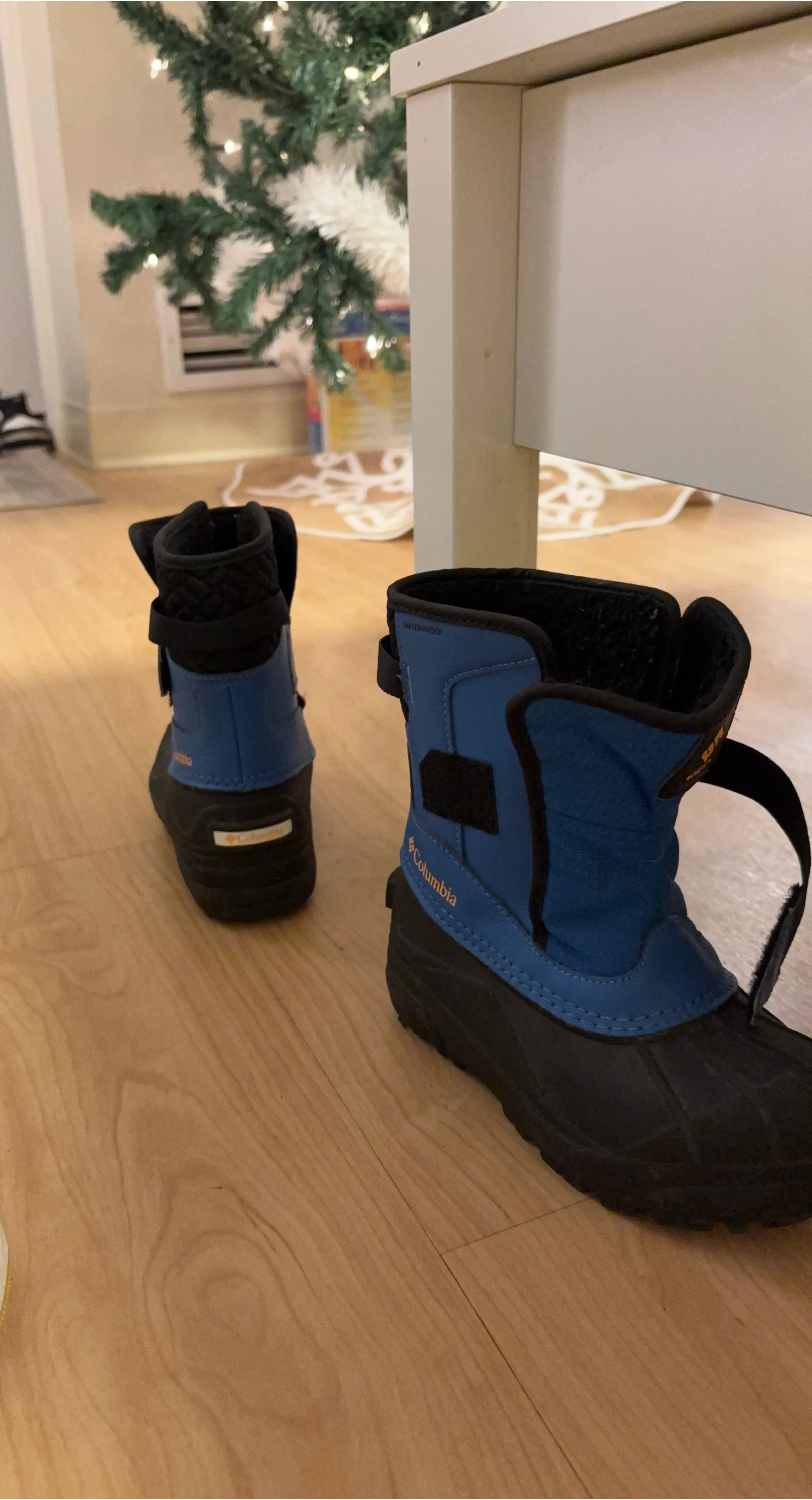 Columbia winter boots for kids. These blue and black boots are waterproof and designed for cold weather. They feature adjustable straps for a secure fit.