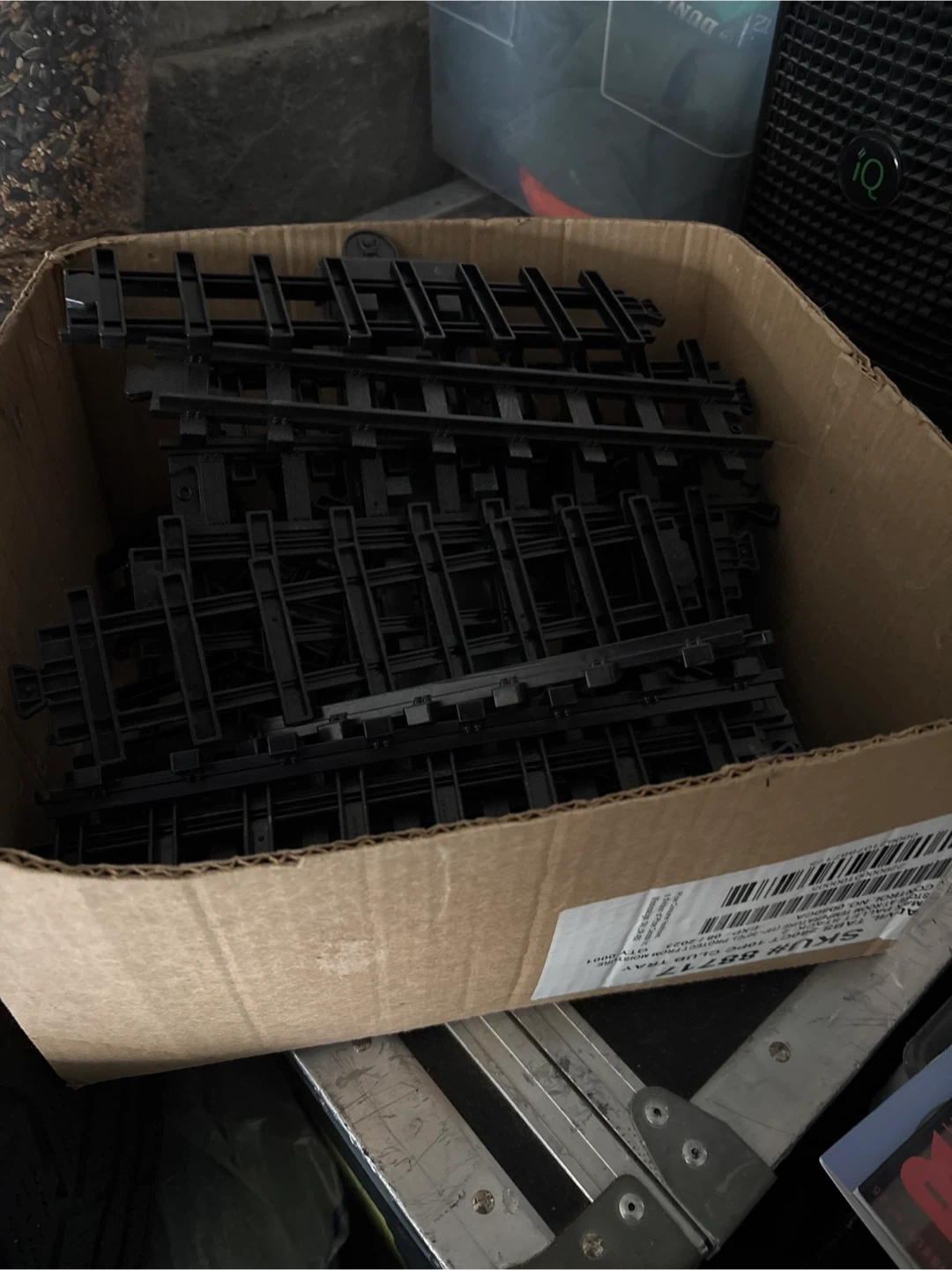 This is a Caterpillar themed toy train set. It includes multiple train cars and a crane piece. Also includes a large box of train tracks. Perfect for young train enthusiasts!