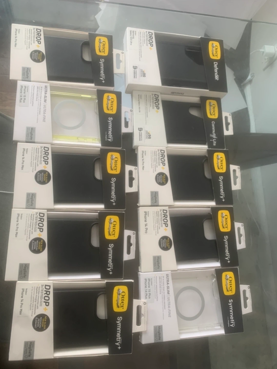 Various Otterbox Symmetry+ and Defender series phone cases available. Includes models for iPhone 14 Pro Max, iPhone 14 Pro, and iPhone 15 Plus. Many cases feature MagSafe compatibility. Drop+ tested for 3x protection. 10$ each