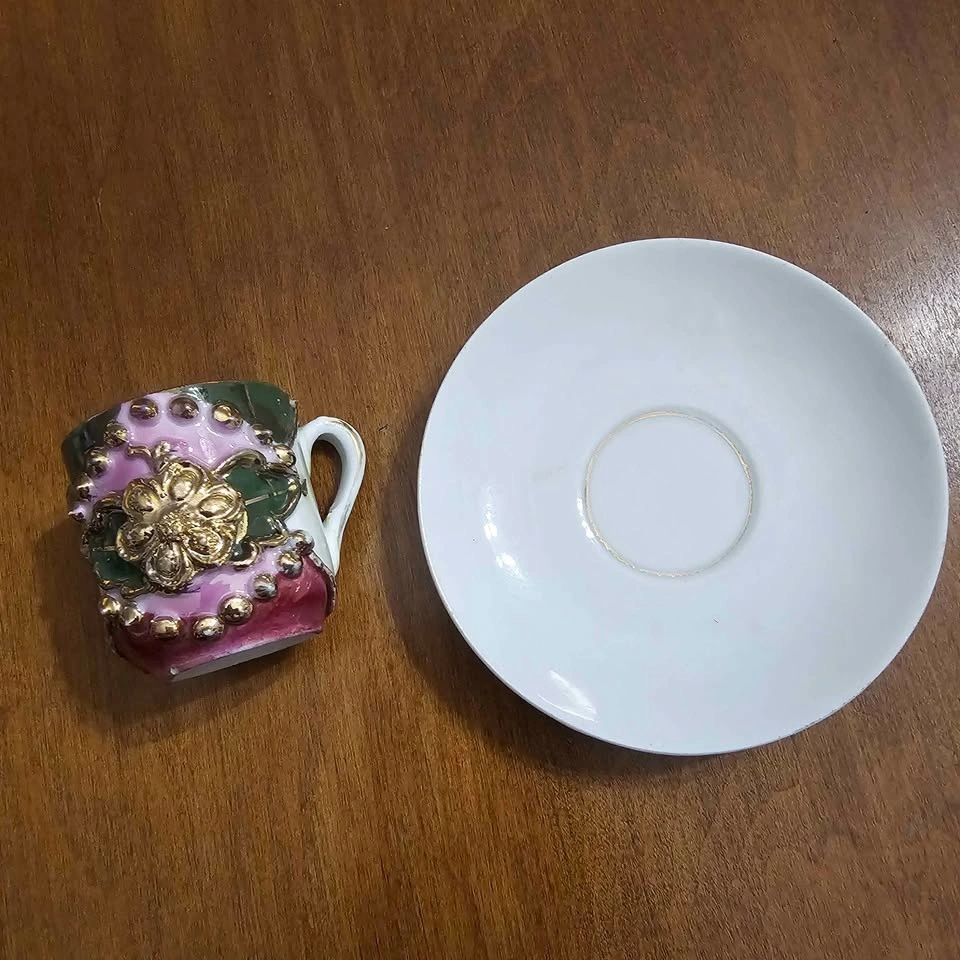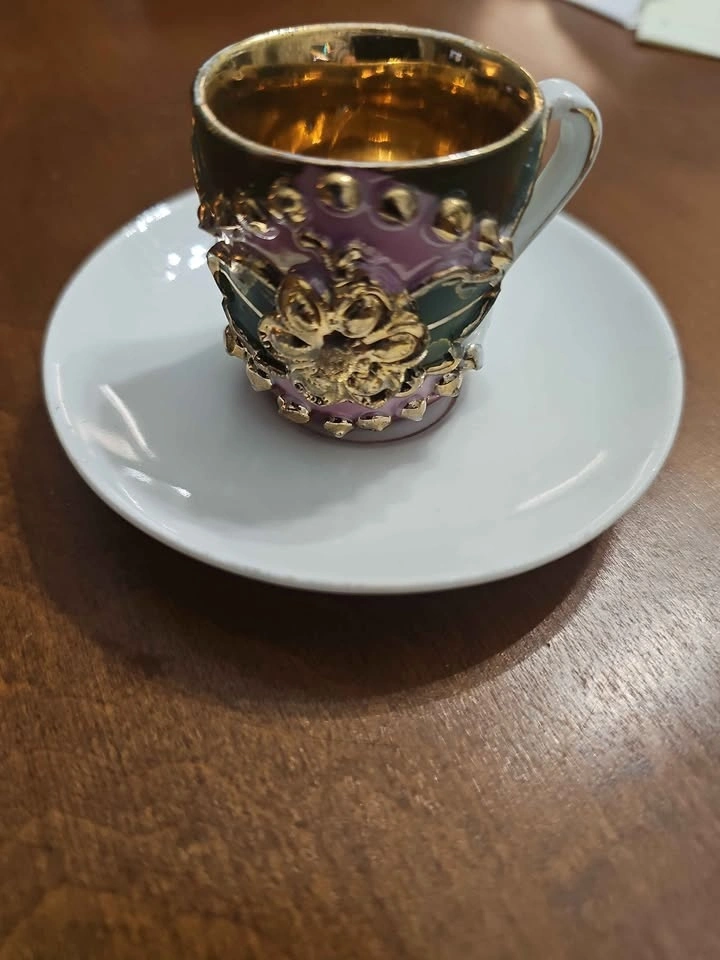 Beautiful vintage miniature espresso / demitasse cup and saucer set, marked Made in Germany on the bottom. Raised enamel detailing in purple & green. Ornate gold baroque accents. Fully gold interior. Mini size (espresso / decorative display). Such a pretty little piece for a cabinet display, tea collection, or vintage decor lover. The gold interior is especially eye-catching in person. Good vintage condition. Light wear to gold consistent with age. No cracks or chips. Pick up 208 & 57 Langley. Non smoking home.