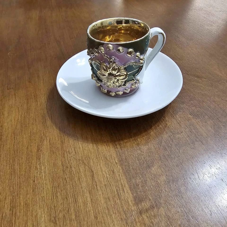 Beautiful vintage miniature espresso / demitasse cup and saucer set, marked Made in Germany on the bottom. Raised enamel detailing in purple & green. Ornate gold baroque accents. Fully gold interior. Mini size (espresso / decorative display). Such a pretty little piece for a cabinet display, tea collection, or vintage decor lover. The gold interior is especially eye-catching in person. Good vintage condition. Light wear to gold consistent with age. No cracks or chips. Pick up 208 & 57 Langley. Non smoking home.