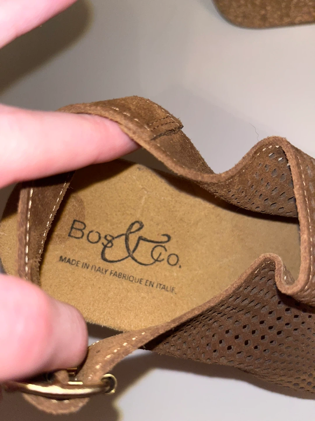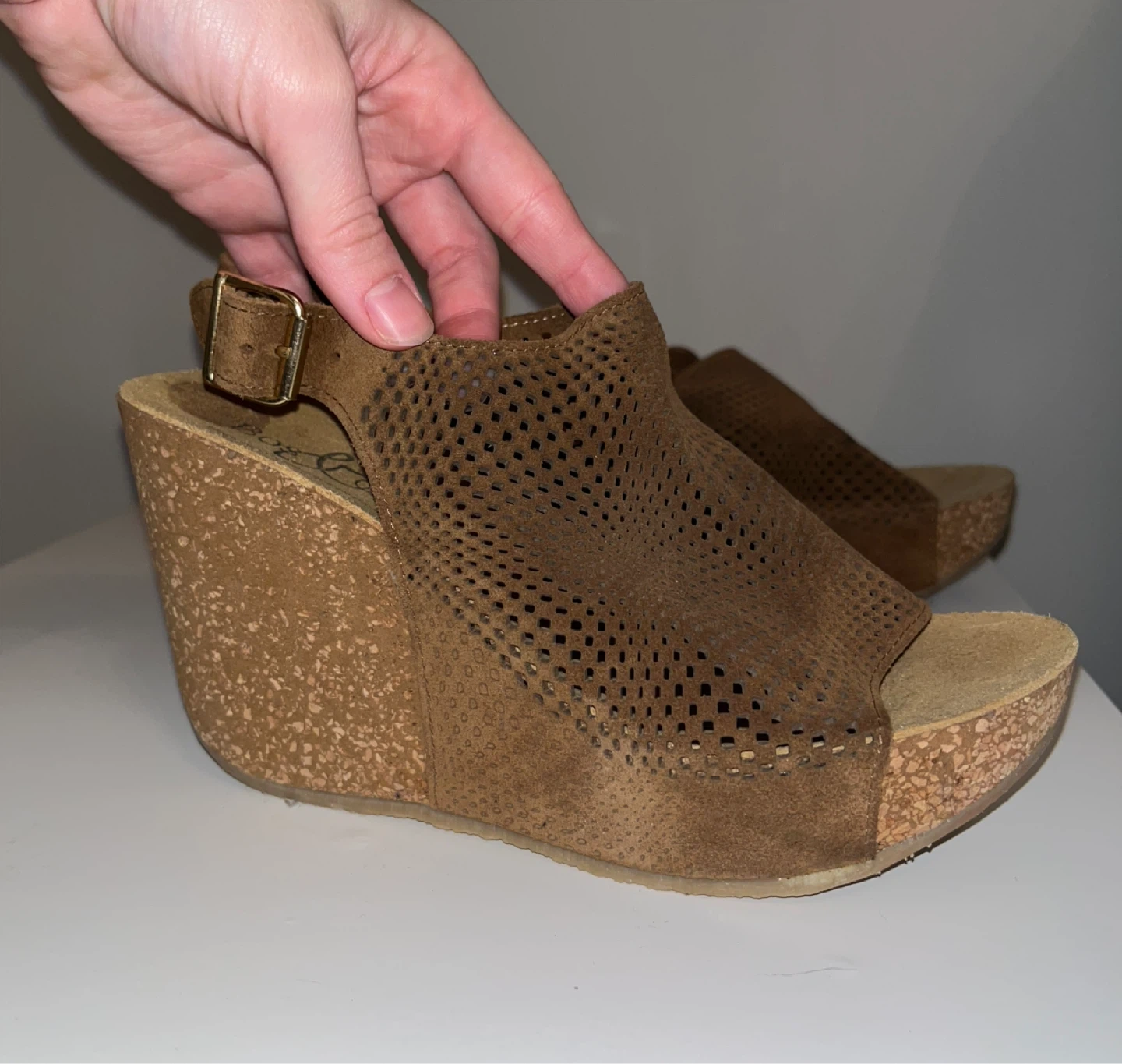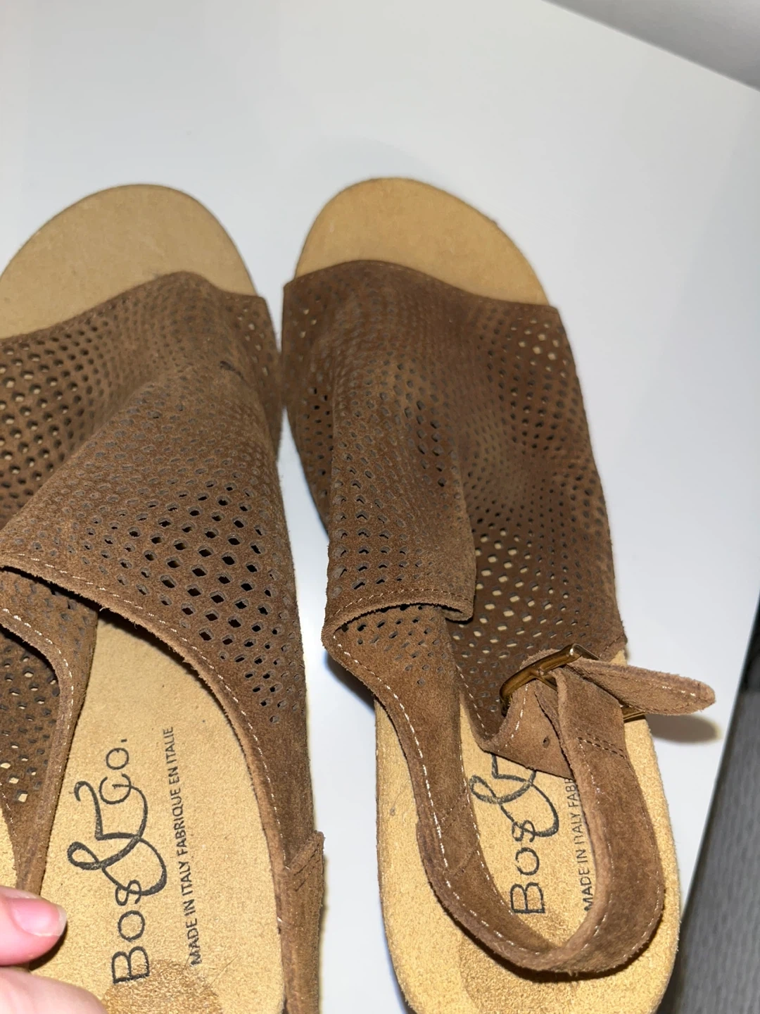Stylish Bogs & Co. wedge sandals in a rich brown hue. These feature a cool perforated design with an adjustable ankle strap for a secure fit. Made in Italy and size 37.