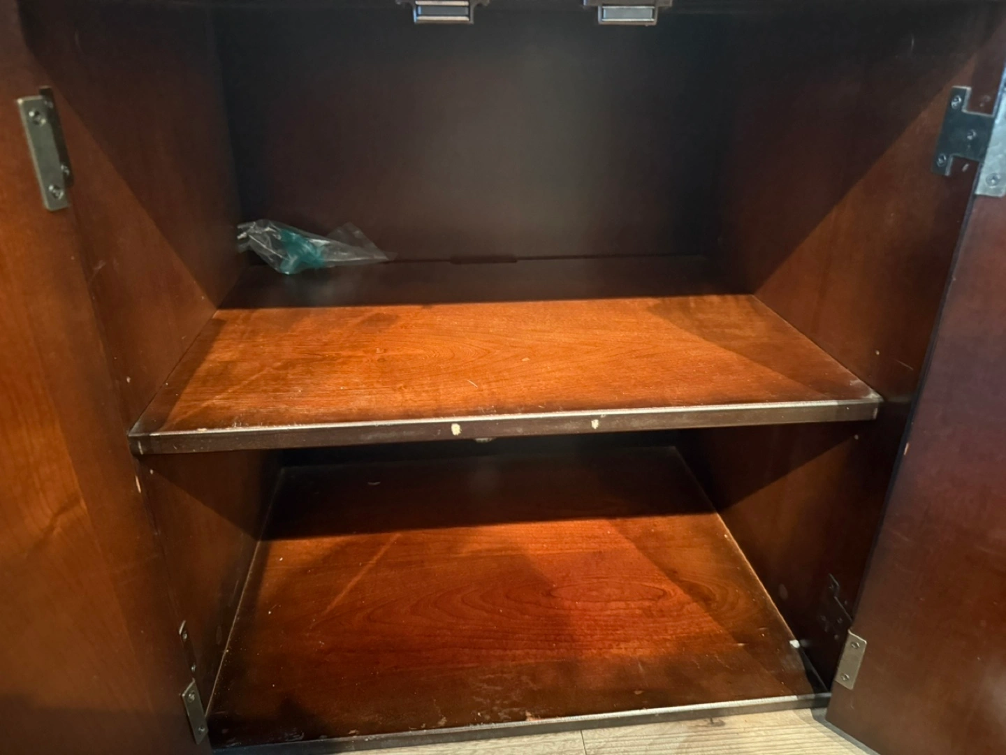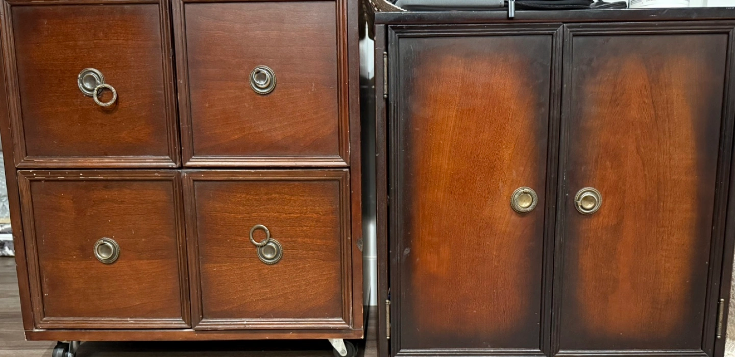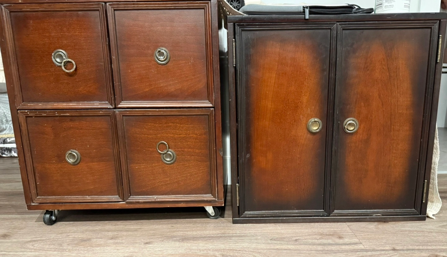 Two attractive dark wood cabinets. One features four drawers, the other two doors. One on rollers. Excellent storage solution.