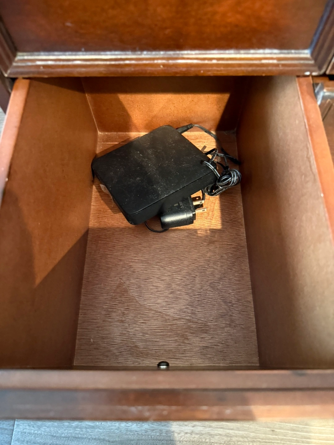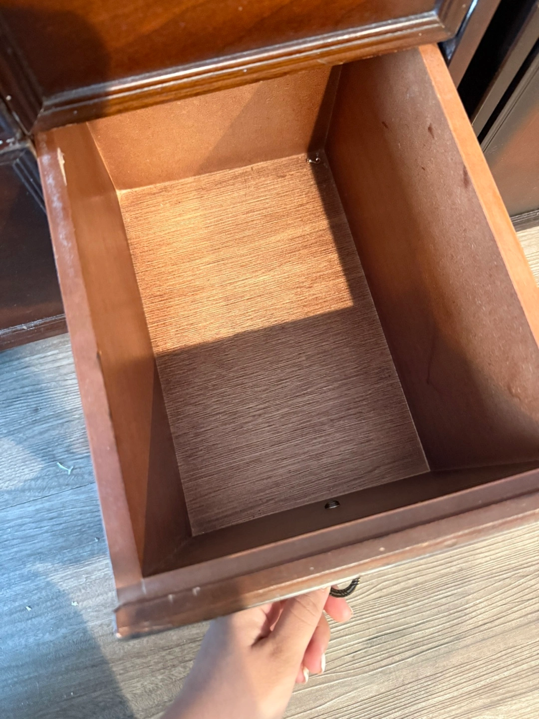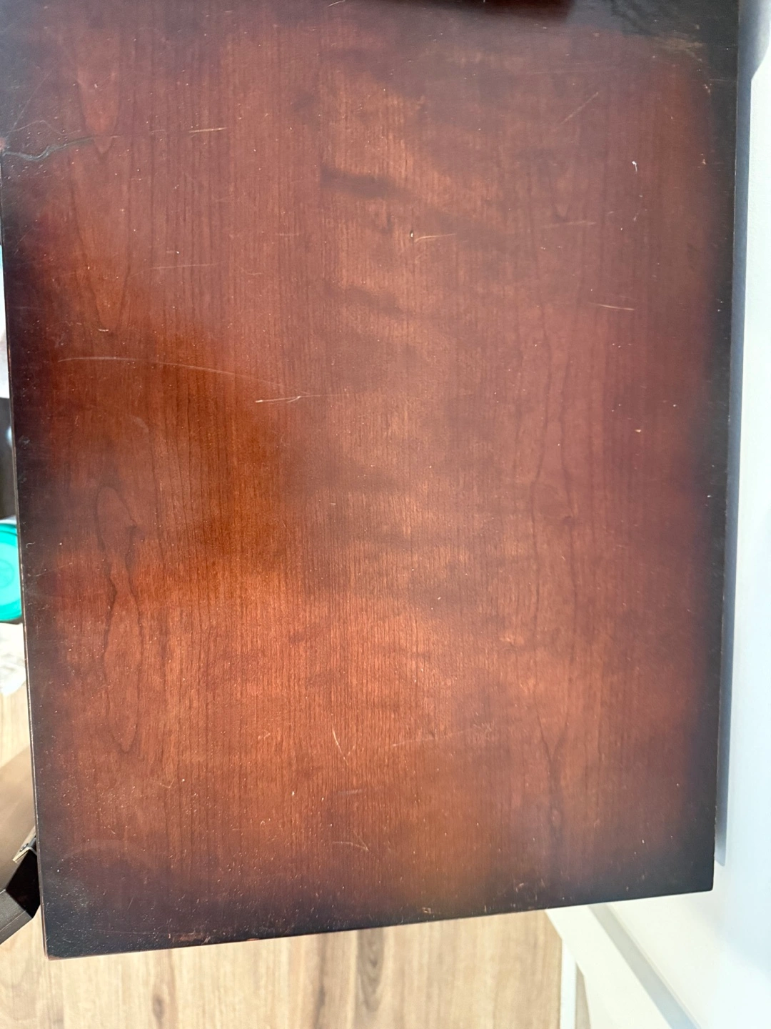 Two attractive dark wood cabinets. One features four drawers, the other two doors. One on rollers. Excellent storage solution.