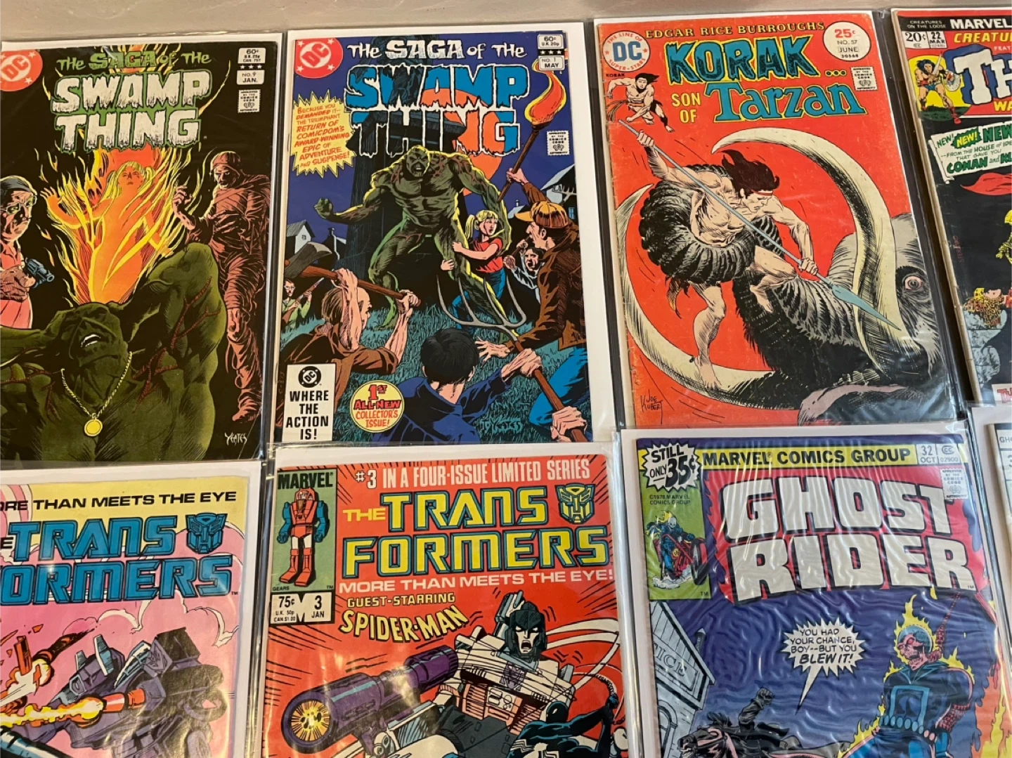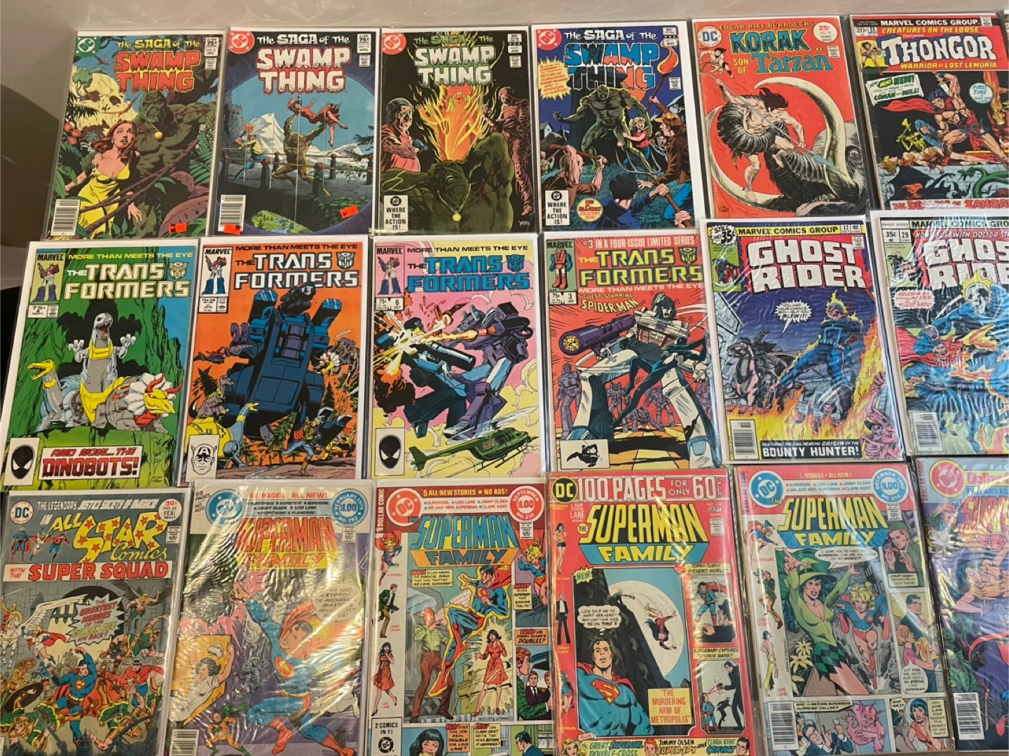 This lot includes various comic books from DC Comics and Marvel Comics. You'll find titles like The Saga of the Swamp Thing, Korak Son of Tarzan, Thongor, The Transformers, Ghost Rider, Superman Family, and All-Star Super Squad. These comics are from the 1970s and 1980s. They're great additions for any comic collector! 60$