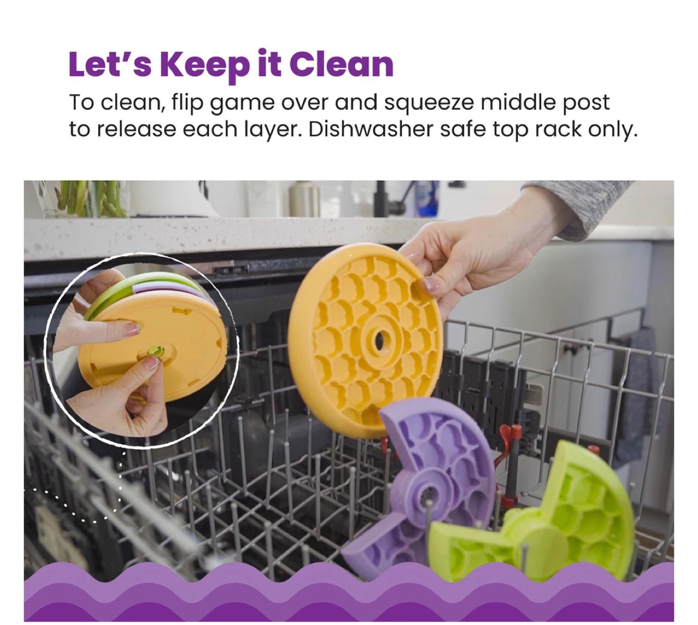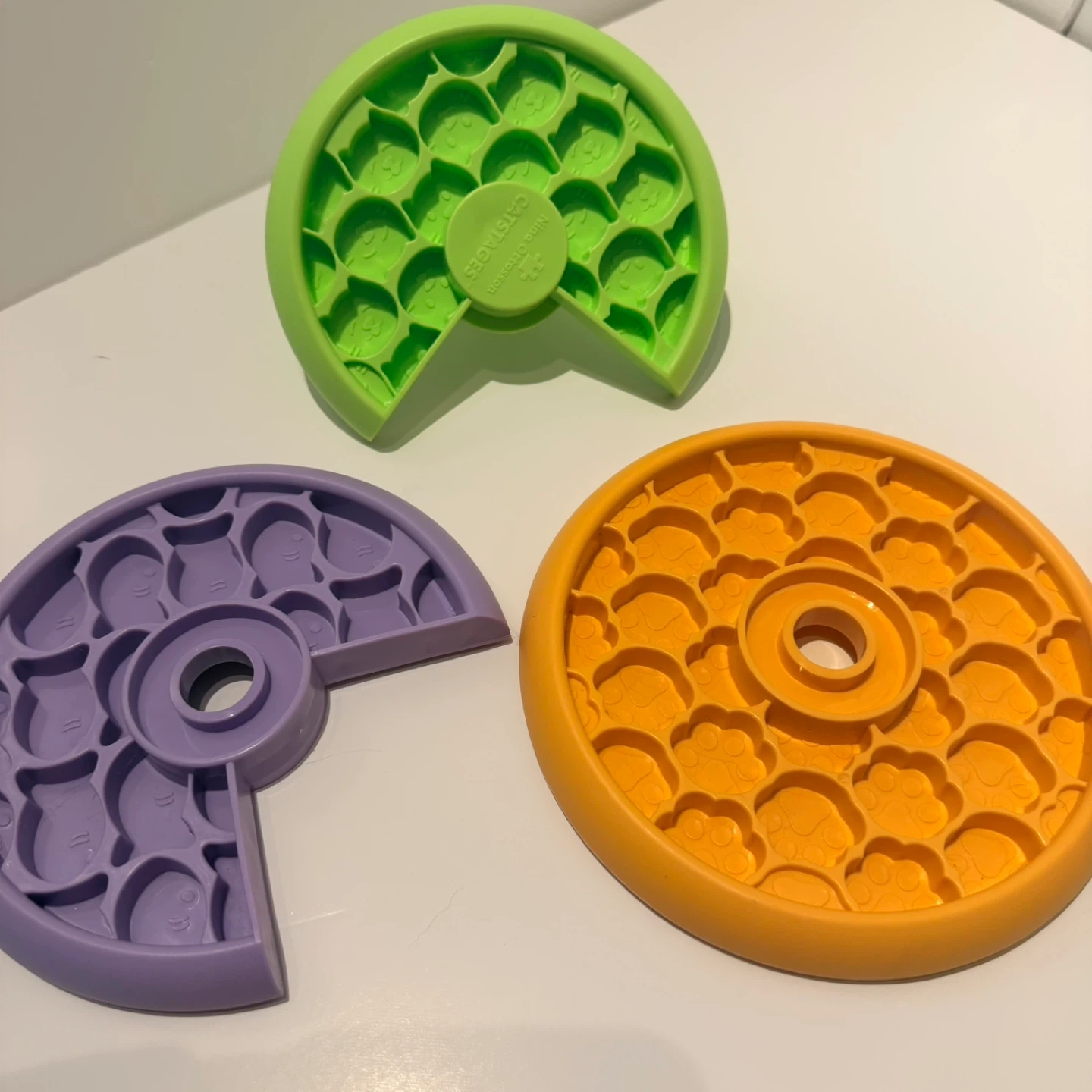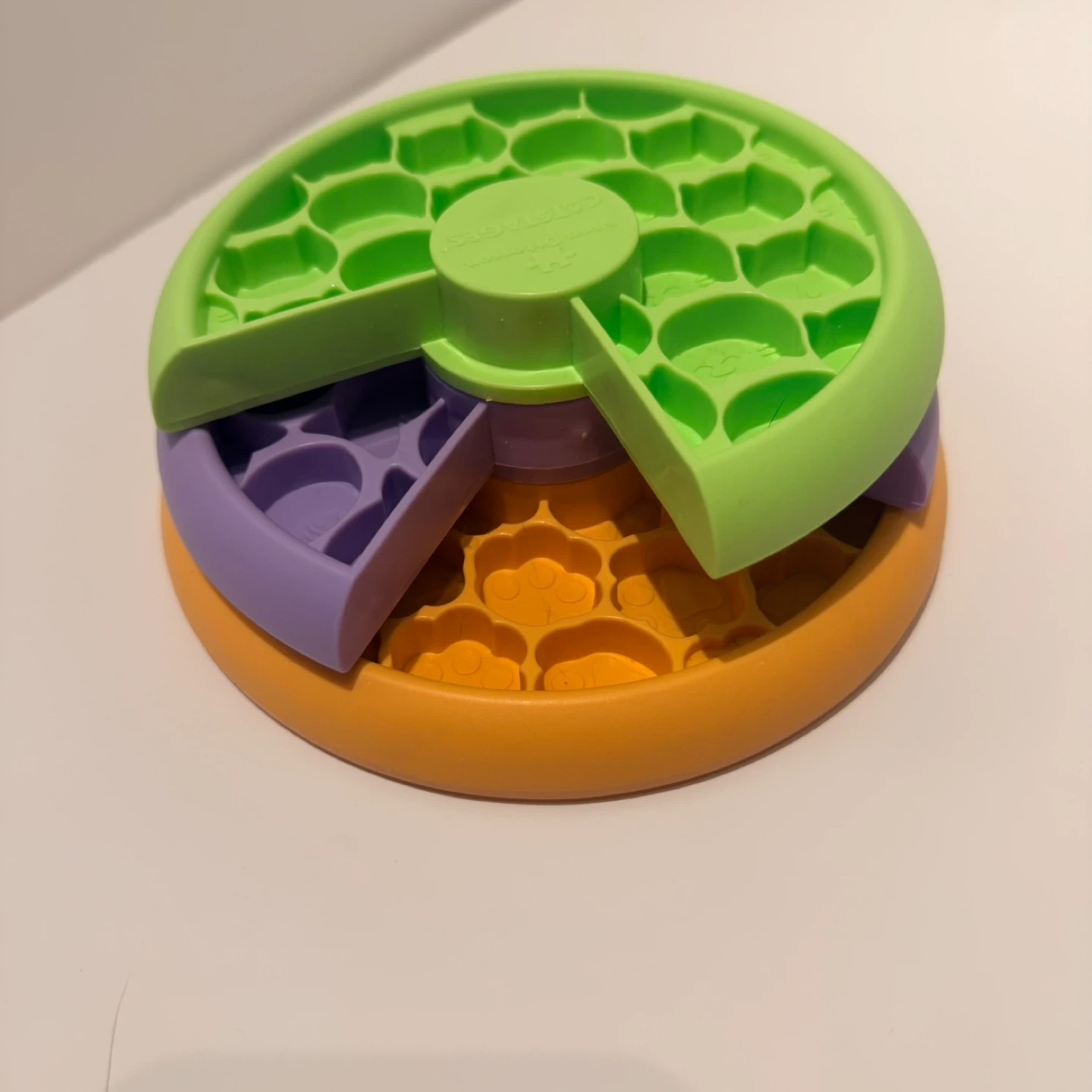 Looking to keep your feline friend entertained during meal times? This Nina Ottosson Catstages Purrfect Feeder is purrfect for slowing down speedy eaters! It holds 1 cup of wet food or 1/2 cup of dry food. It's also easy to clean, just flip it over and squeeze the middle post to release each layer. It's dishwasher safe too, top rack only!