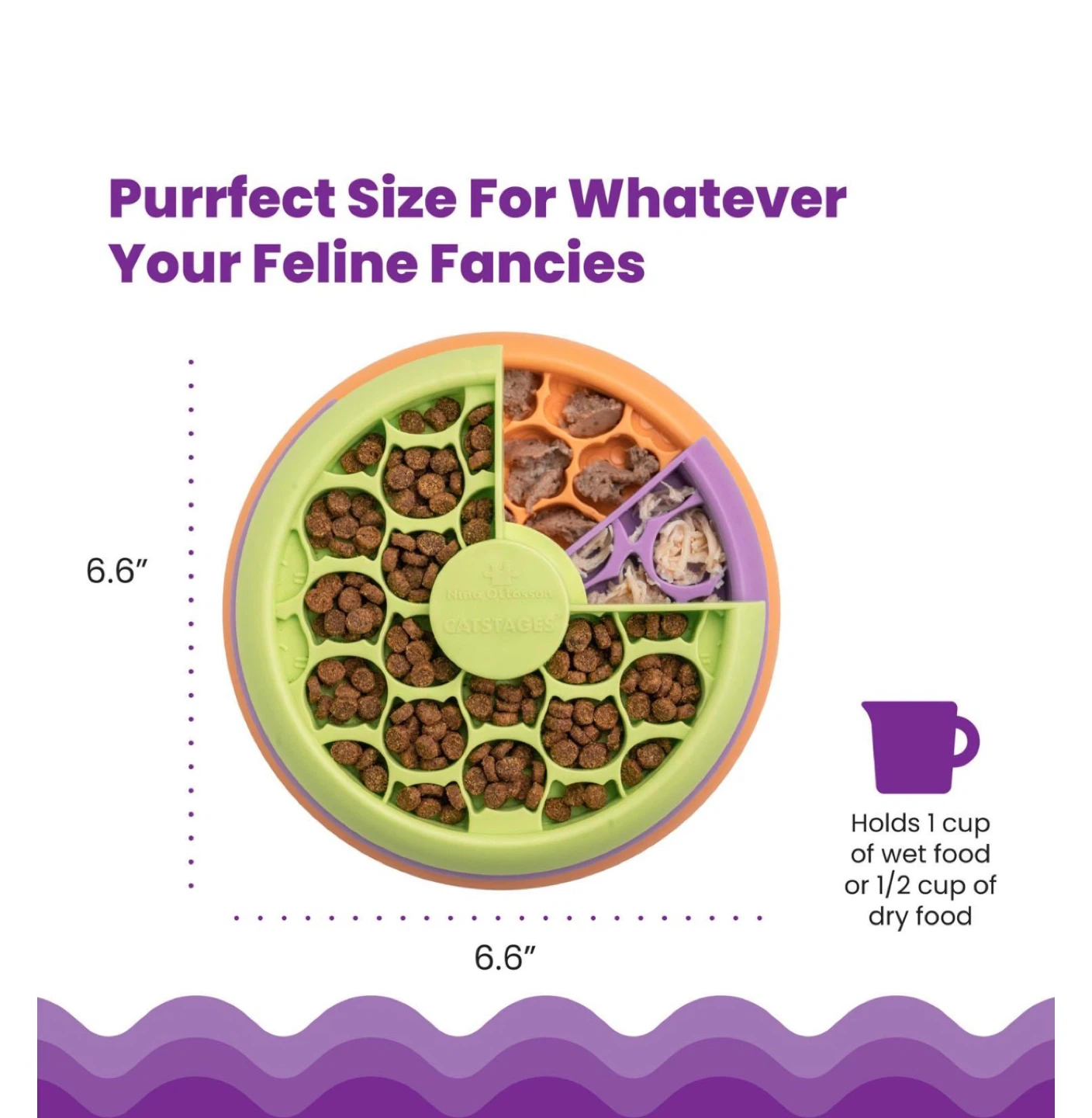 Looking to keep your feline friend entertained during meal times? This Nina Ottosson Catstages Purrfect Feeder is purrfect for slowing down speedy eaters! It holds 1 cup of wet food or 1/2 cup of dry food. It's also easy to clean, just flip it over and squeeze the middle post to release each layer. It's dishwasher safe too, top rack only!