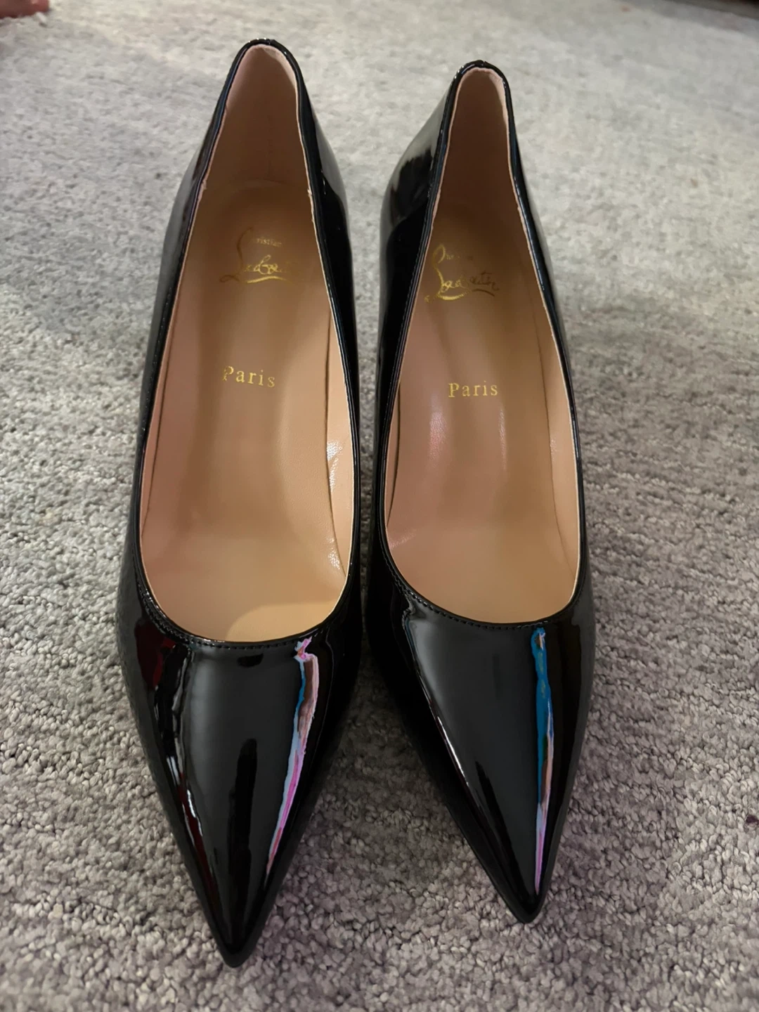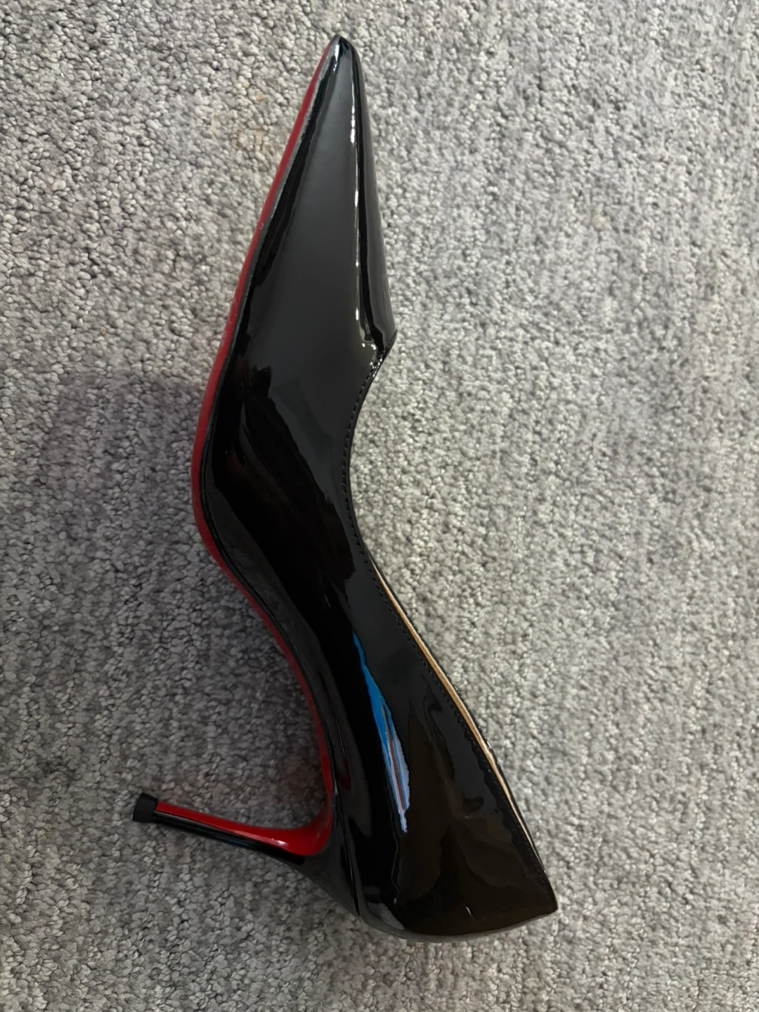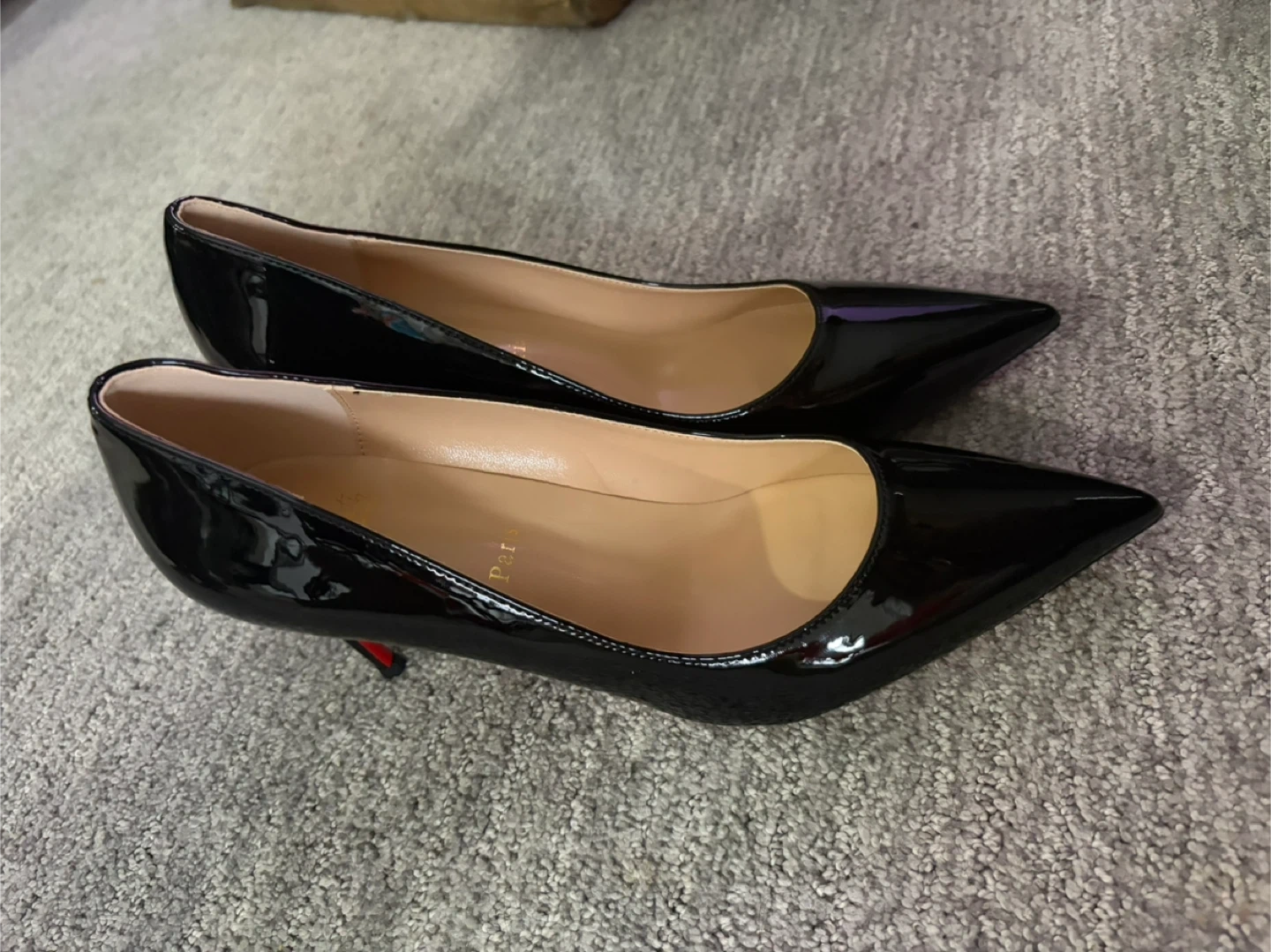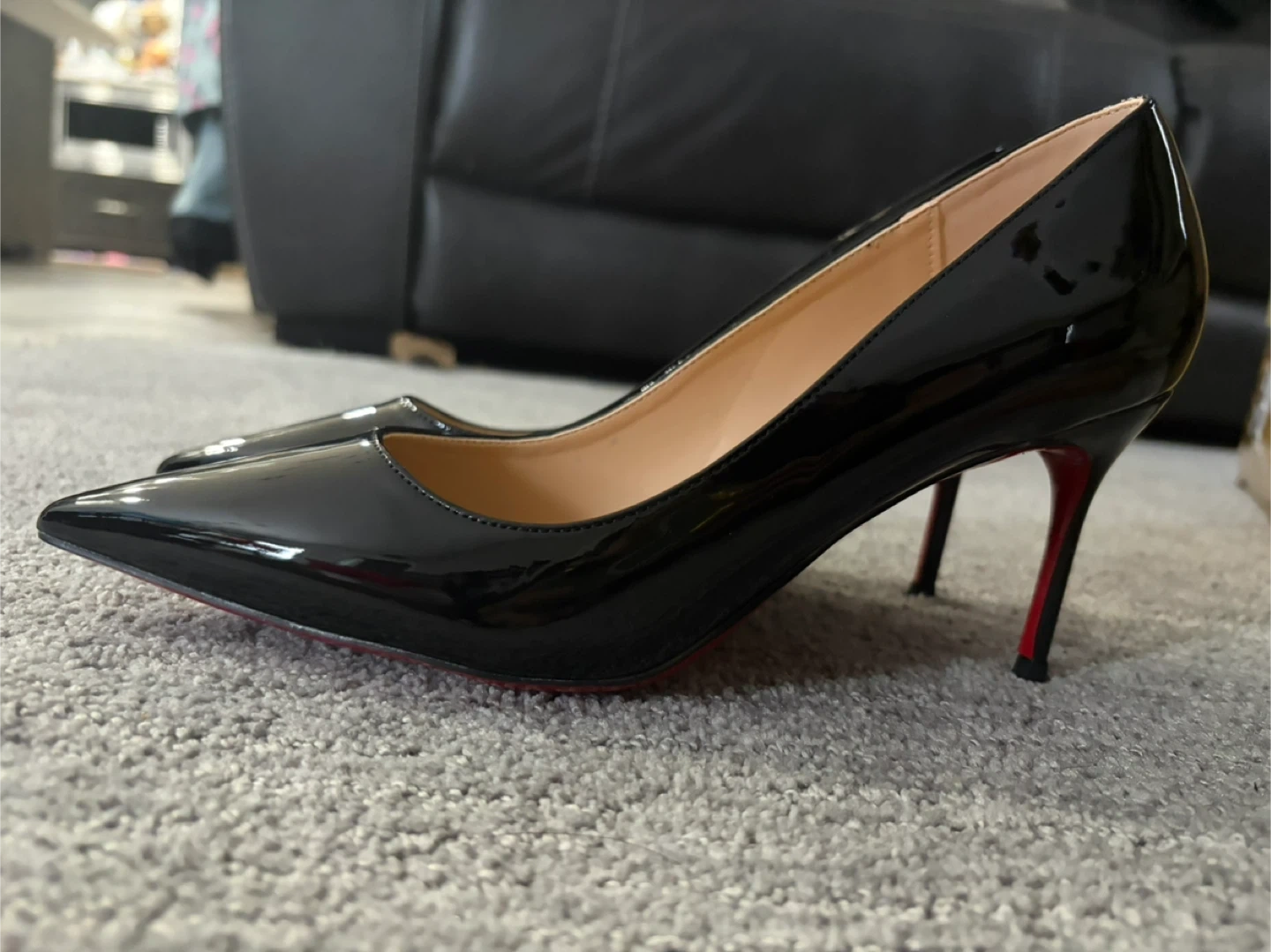Stunning Louboutin style black leather pumps. These elegant heels feature the iconic red sole and a classic pointed-toe silhouette. Perfect for dressing up any outfit!