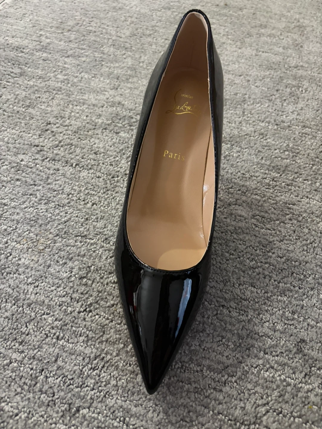 Stunning Louboutin style black leather pumps. These elegant heels feature the iconic red sole and a classic pointed-toe silhouette. Perfect for dressing up any outfit!