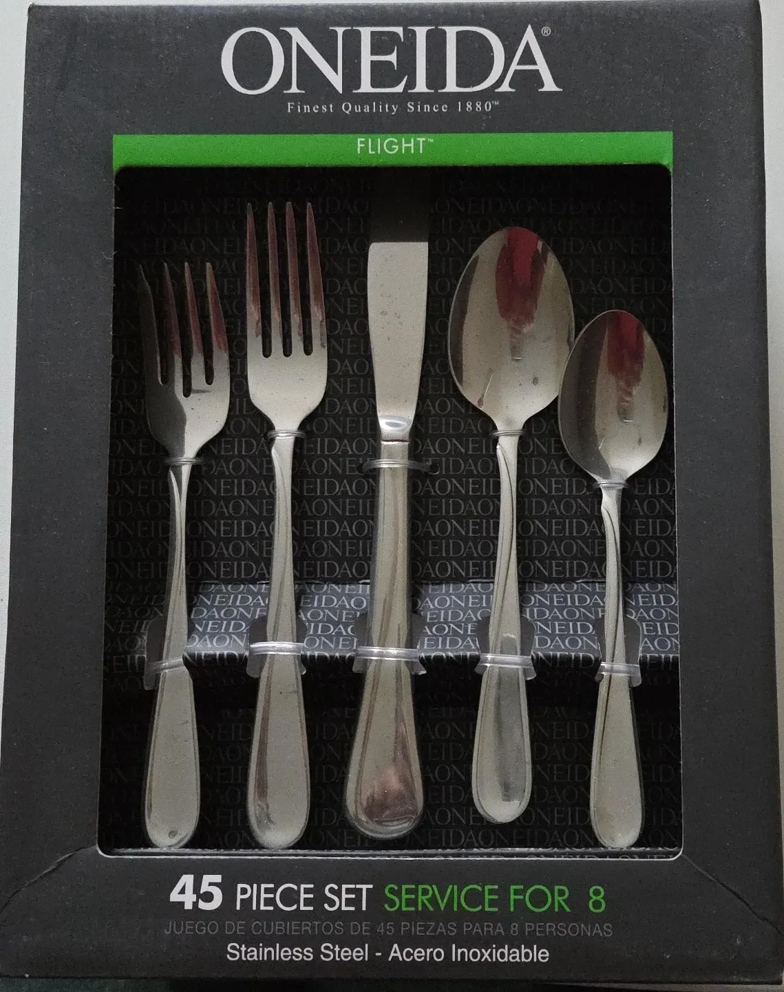 Selling a brand new Oneida Flight 45-piece flatware set! This set is service for 8 and made of stainless steel. Perfect for everyday use or special occasions