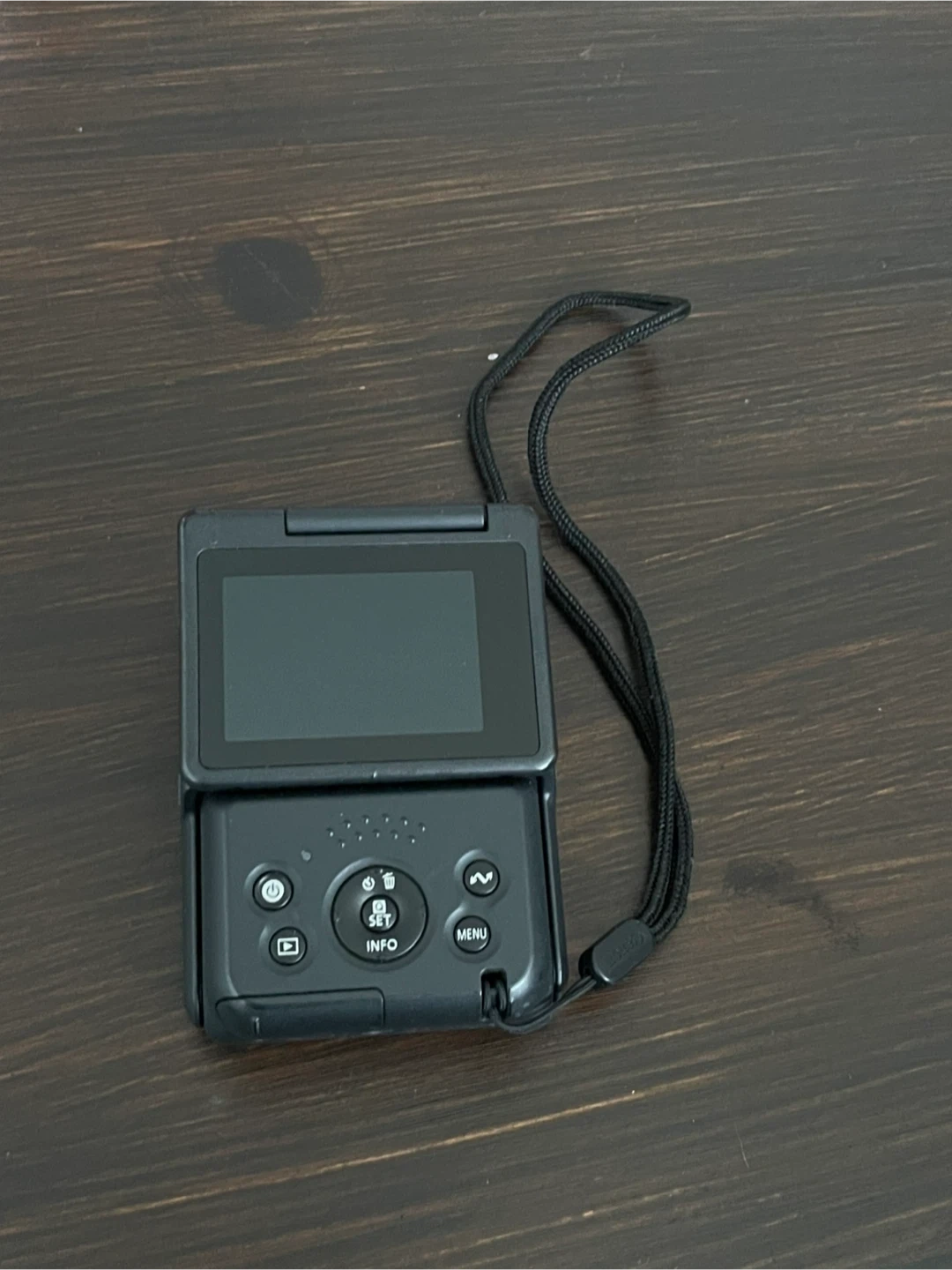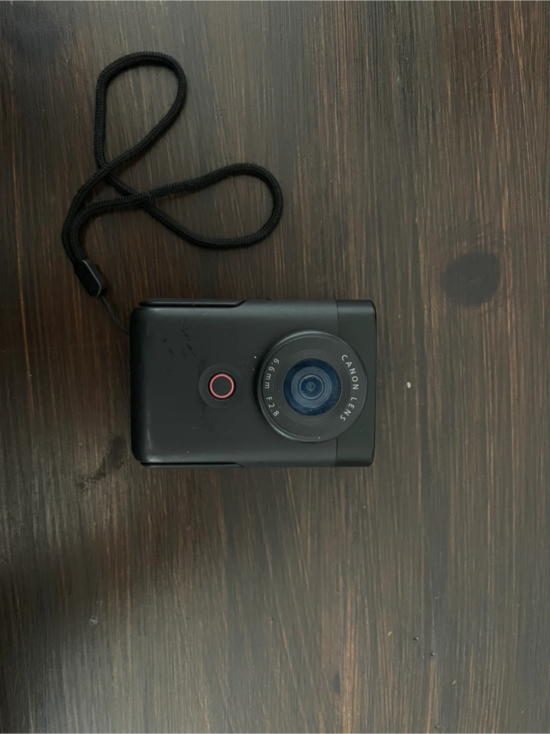 This is a black Canon PowerShot V10 video camera. It features a 6.6mm f/2.8 lens and a flip-up screen. Comes with a wrist strap. It's great for on the go videos. In amazing condition looking to sell as soon as.