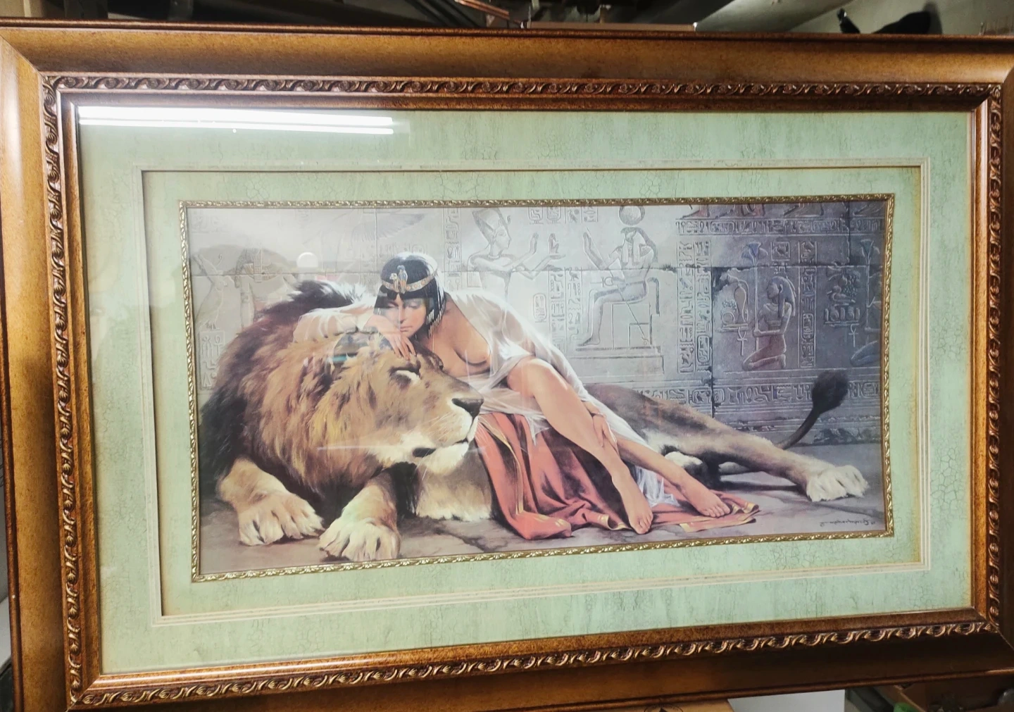 A framed art print titled "The Lion and the Woman" by Maher Morcos, dated 1995. The artwork depicts a woman reclining on a lion with Egyptian hieroglyphs in the background. It's housed in a decorative gold-toned frame.
