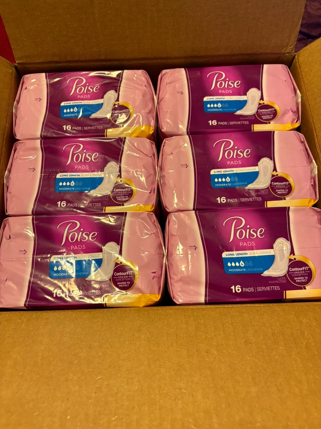 Six (6) packs of Poise Pads, Long Length, Ultra Protection, Moderate Absorbency. Each pack contains 16 pads. ContourFIT design for protection.