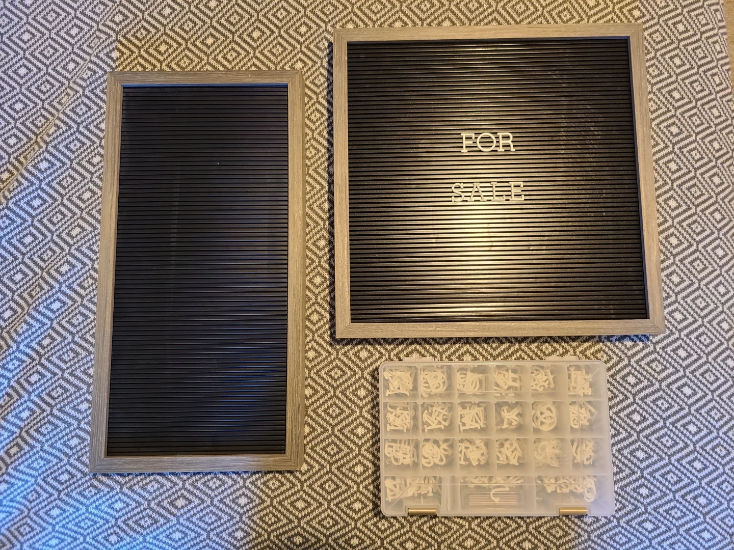 Includes two black letter boards with grey wood frames and a container of white letters and numbers. Great for customizing messages or signs. Perfect for events, classrooms, or home decor!