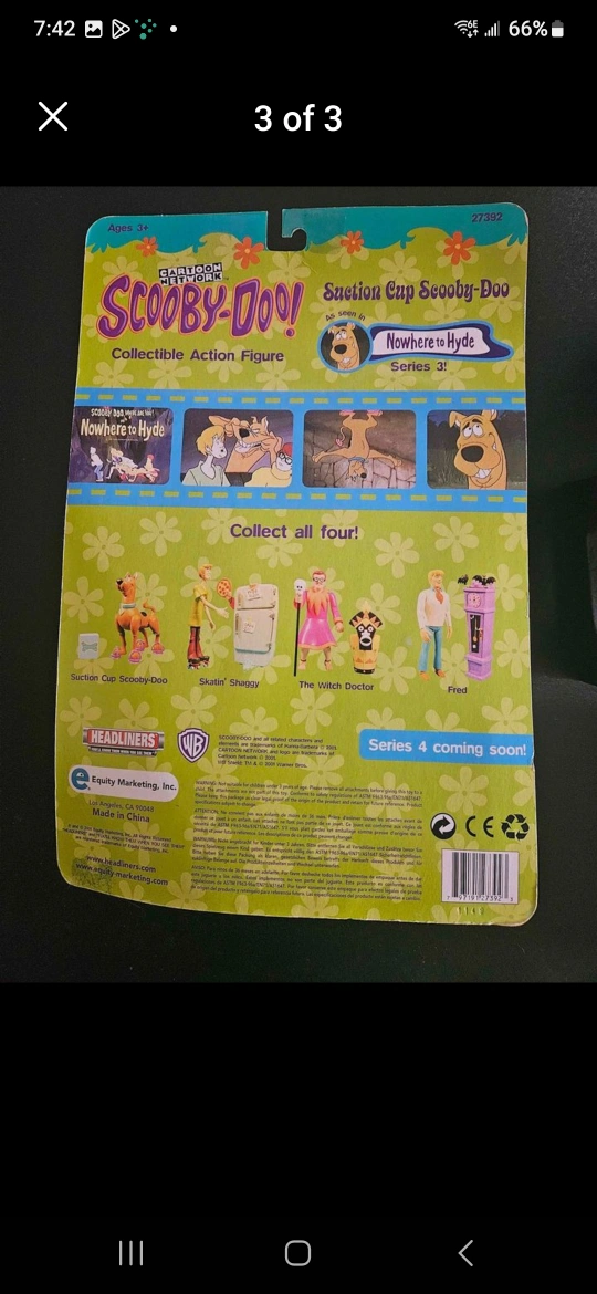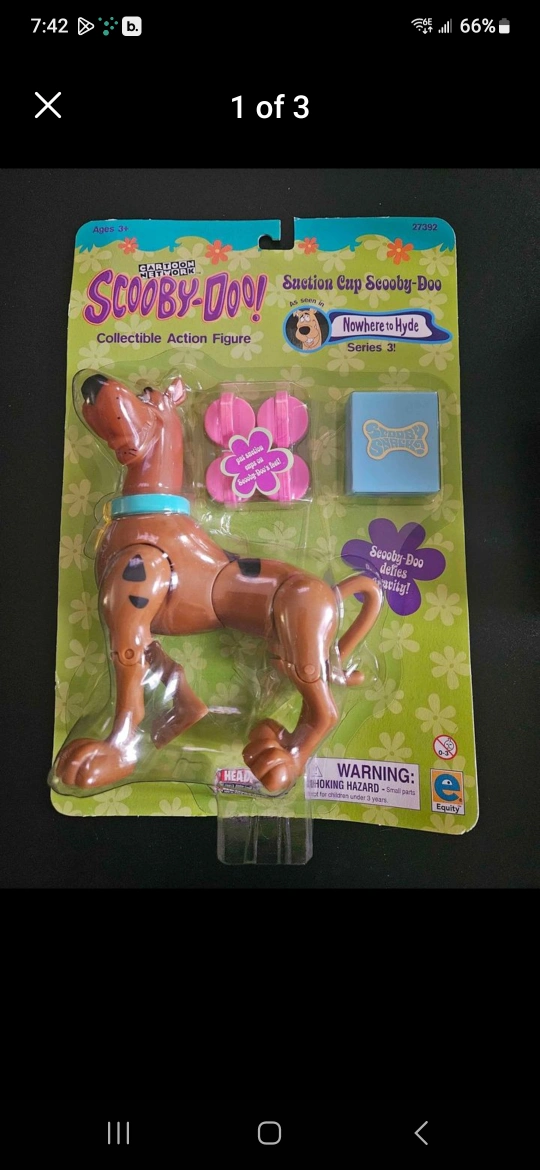 Scooby Doo collectible action figure suction cup Scooby Doo as seen in series 3 episode Nowhere to Hyde. New in package, bought many years ago and never opened. Just on display in a glass cabinet as part of my collection. Great collectible to add to any Scooby Doo fans collection. I believe they do not make these anymore. From a smoke free, pet friendly home in Woodstock. Cross posted.
