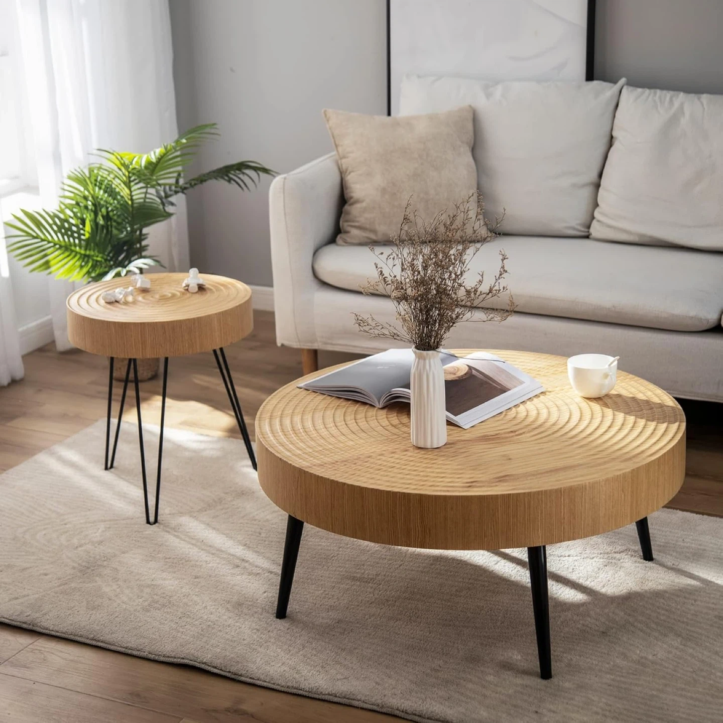 Set of two wood slice tables with black metal hairpin legs. Features a unique textured wood grain surface. Great for living rooms or as accent pieces!