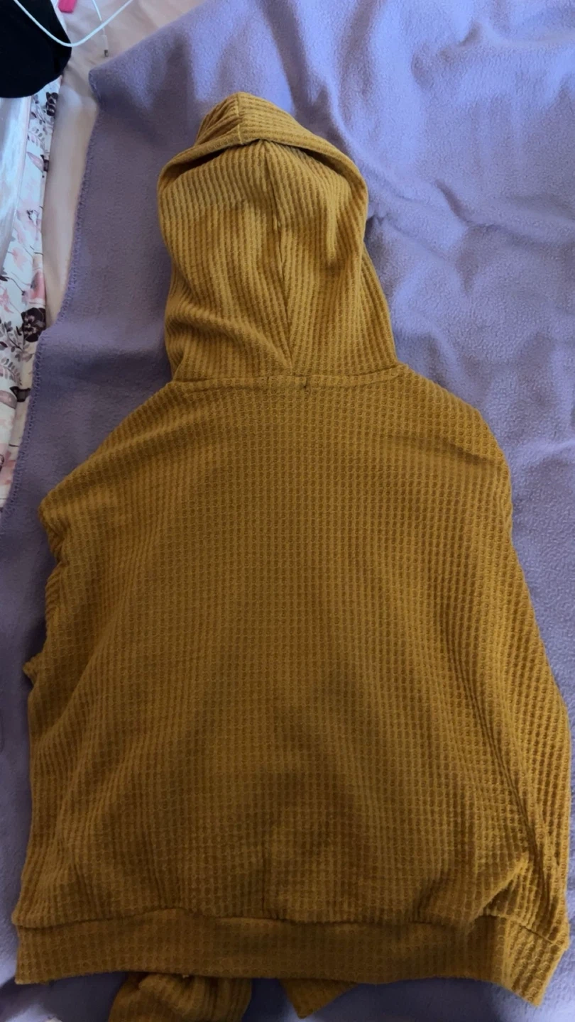 This is a U2B hooded top with a waffle knit texture. It's a mustard yellow colour and made of a comfortable material. The size is L. It's great for layering on cooler days!