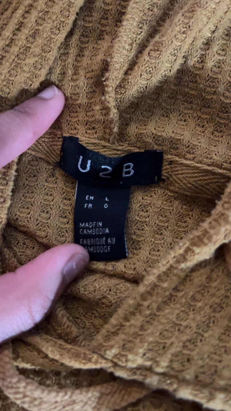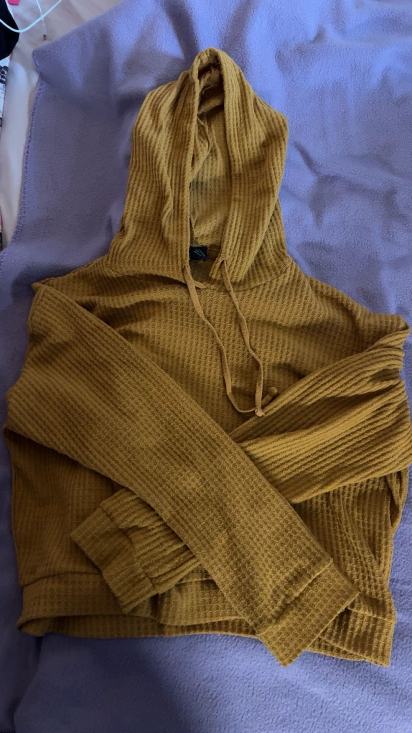 This is a U2B hooded top with a waffle knit texture. It's a mustard yellow colour and made of a comfortable material. The size is L. It's great for layering on cooler days!