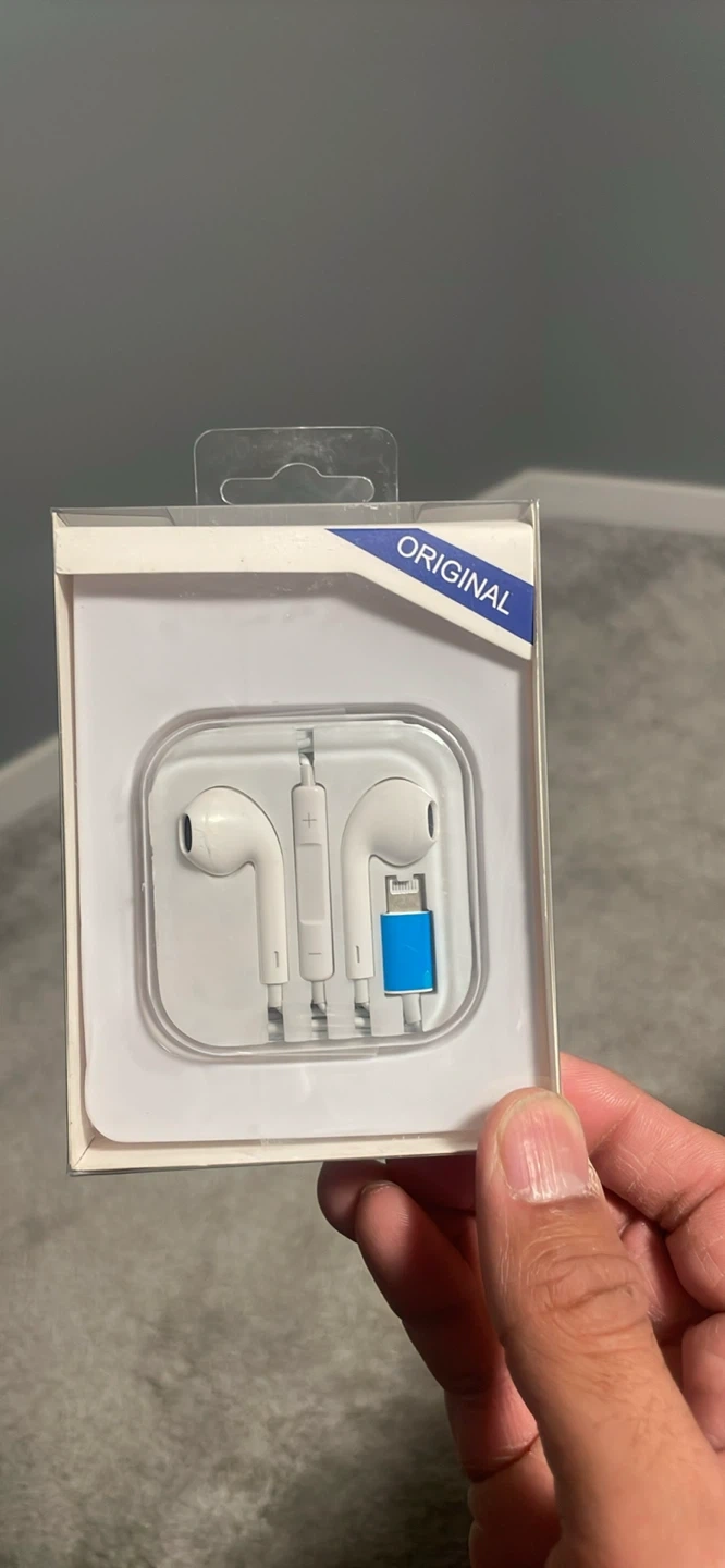 These are original Apple EarPods with a Lightning connector. They're white and designed for easy connectivity. Includes inline remote and microphone for calls and music control.