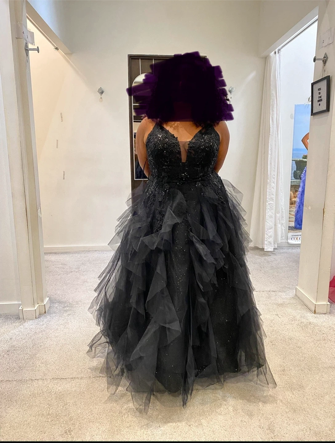 Gorgeous black ball gown featuring a V-neck bodice adorned with sequins and intricate detailing. The skirt is made of voluminous layers of black tulle with a subtle sparkle throughout. It's perfect for a formal event, grad or prom.