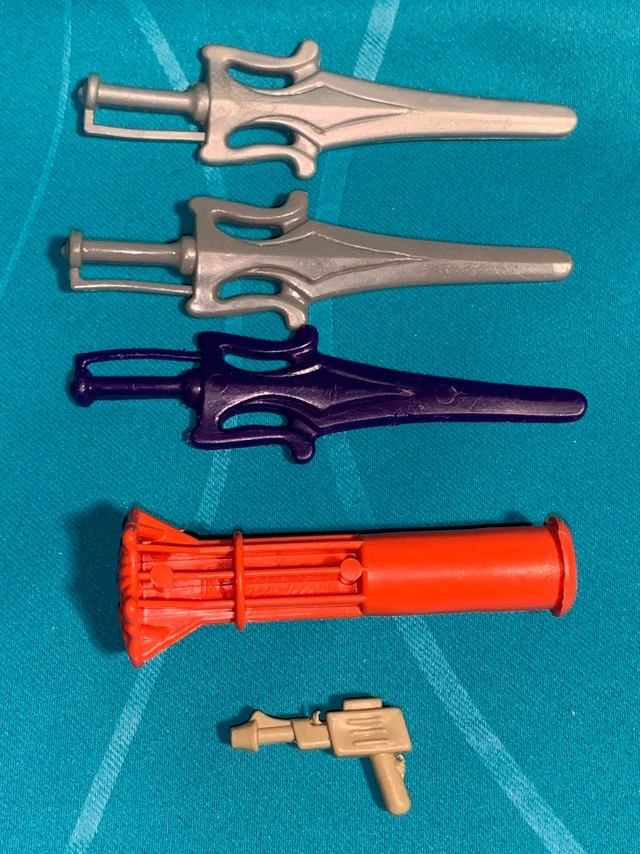 A nice group of vintage accessories from the Masters of the Universe line (MOTU). Battle Ram Missile - SOLD - Power swords - $25 each - Castle Greyskull Pistol - $30 buy them all for $90