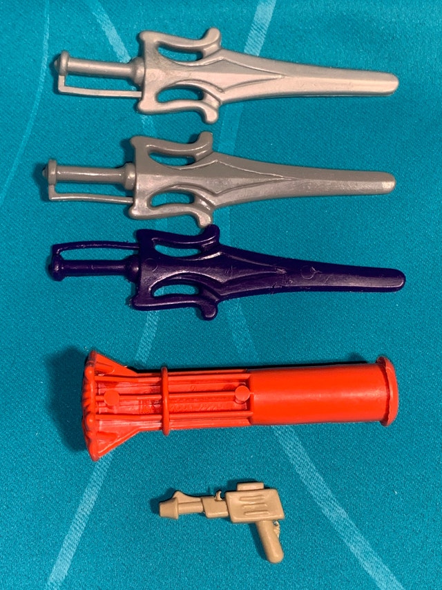 A nice group of vintage accessories from the Masters of the Universe line (MOTU). Battle Ram Missile - SOLD - Power swords - $25 each - Castle Greyskull Pistol - $30 buy them all for $90