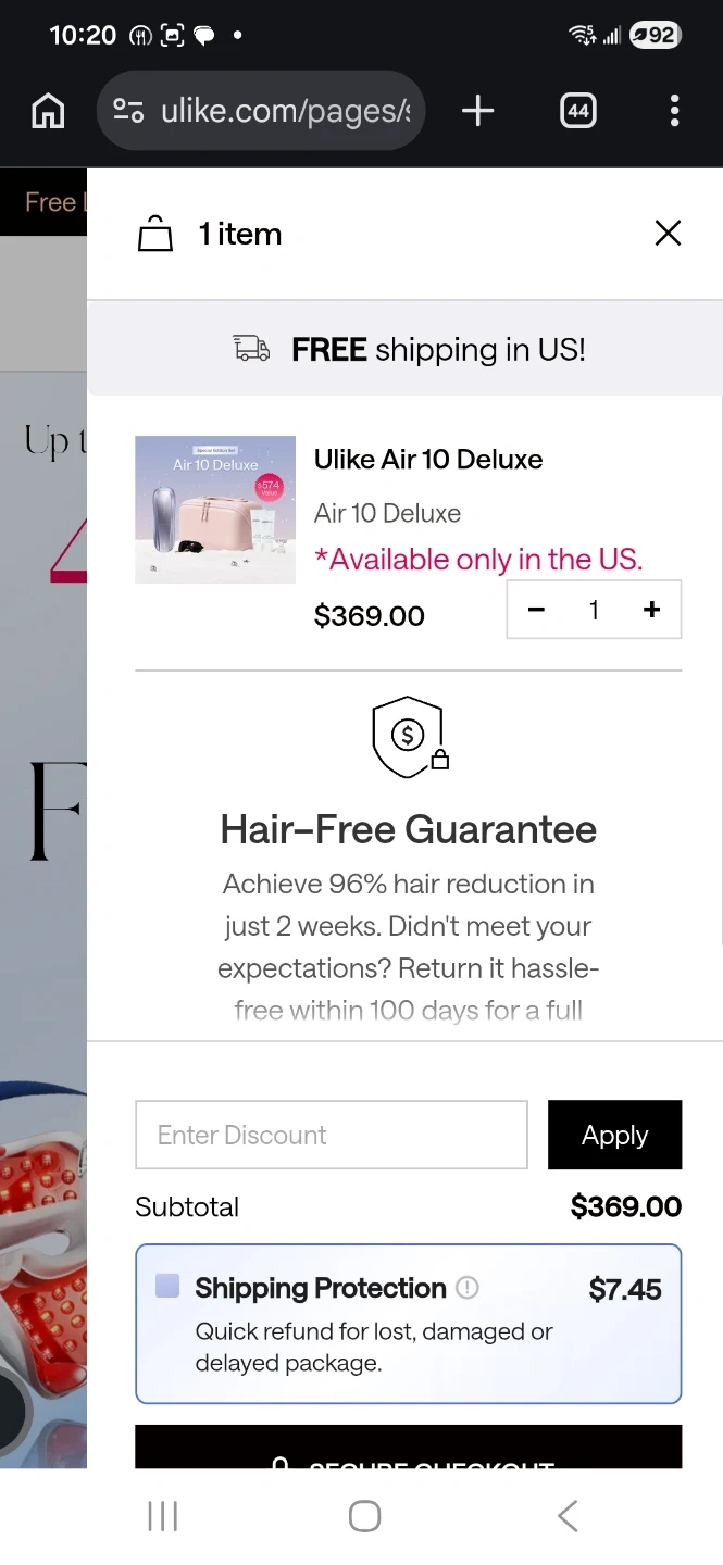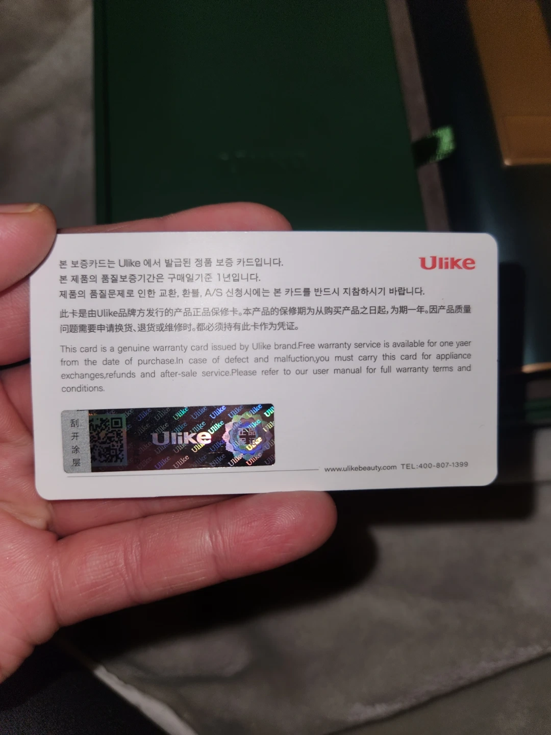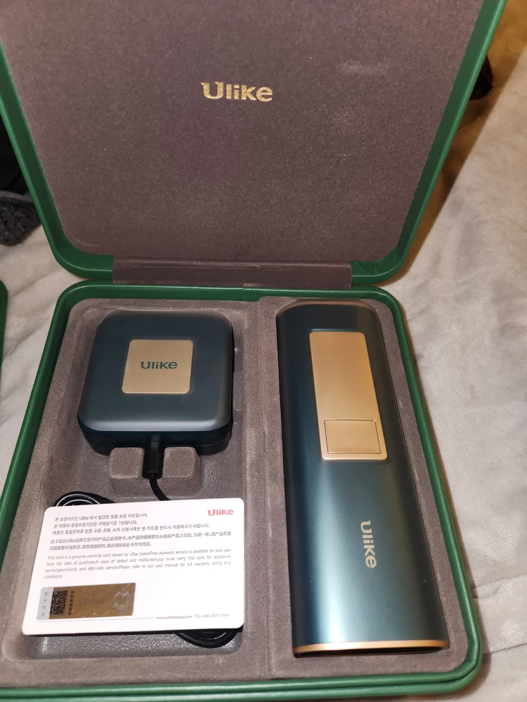 This Ulike hair removal device comes with its original case and charging accessories. It's designed for at-home use. Includes warranty card.