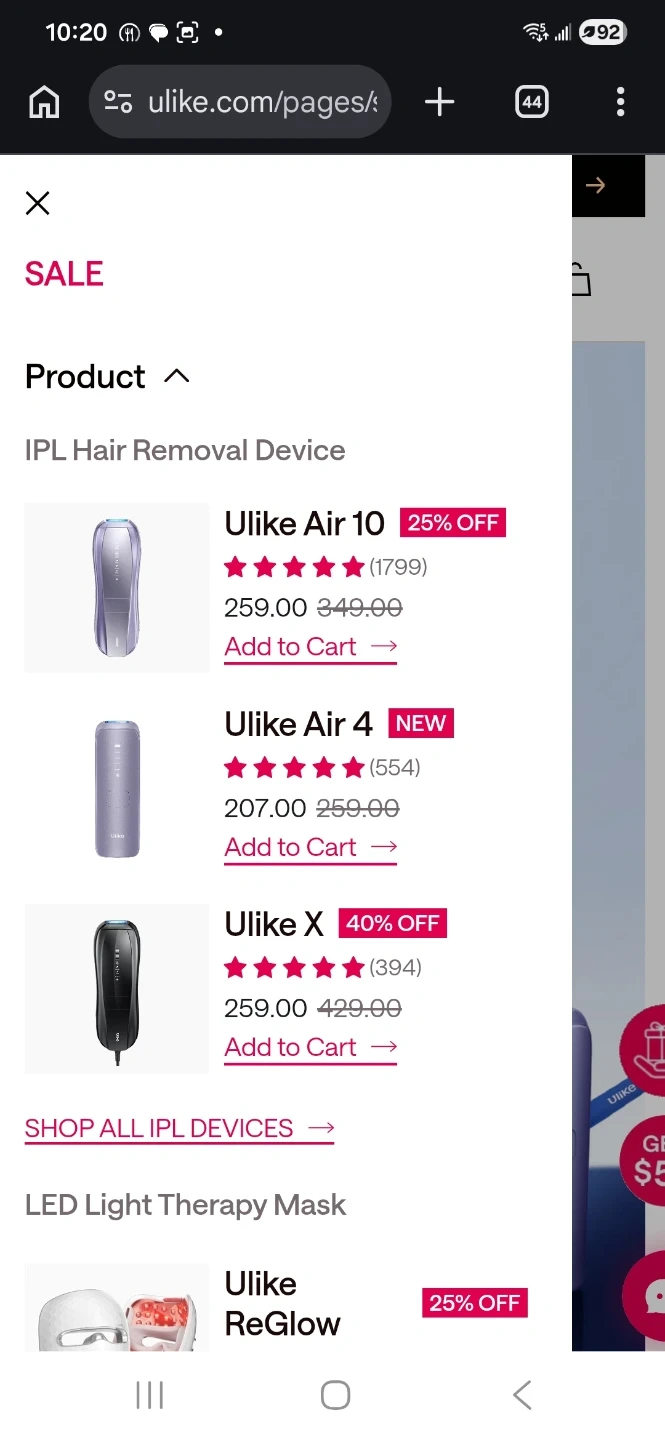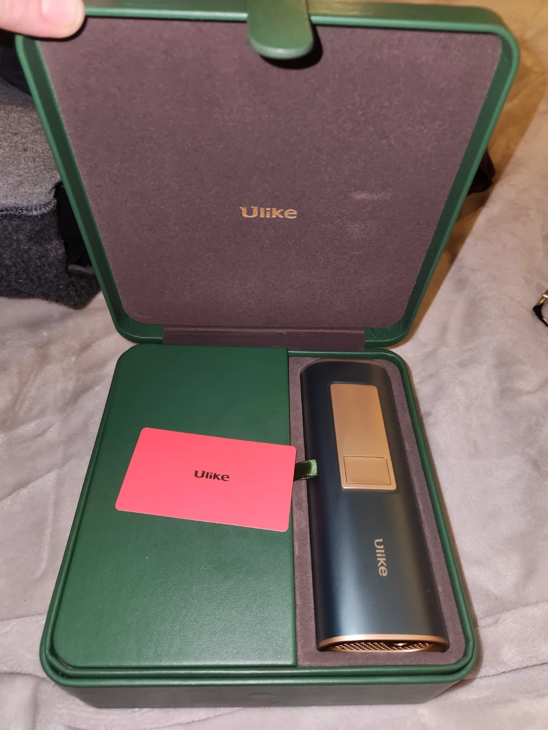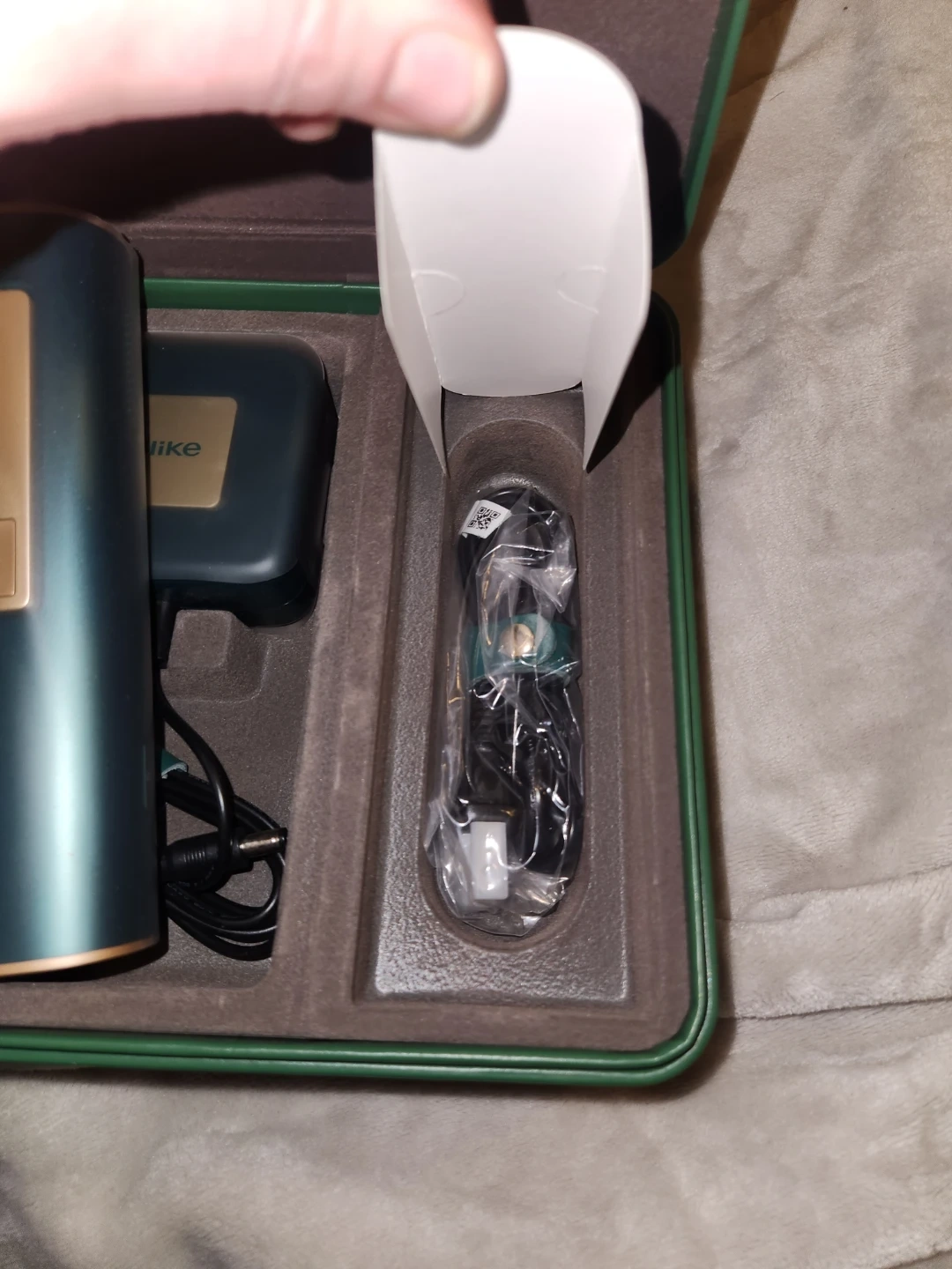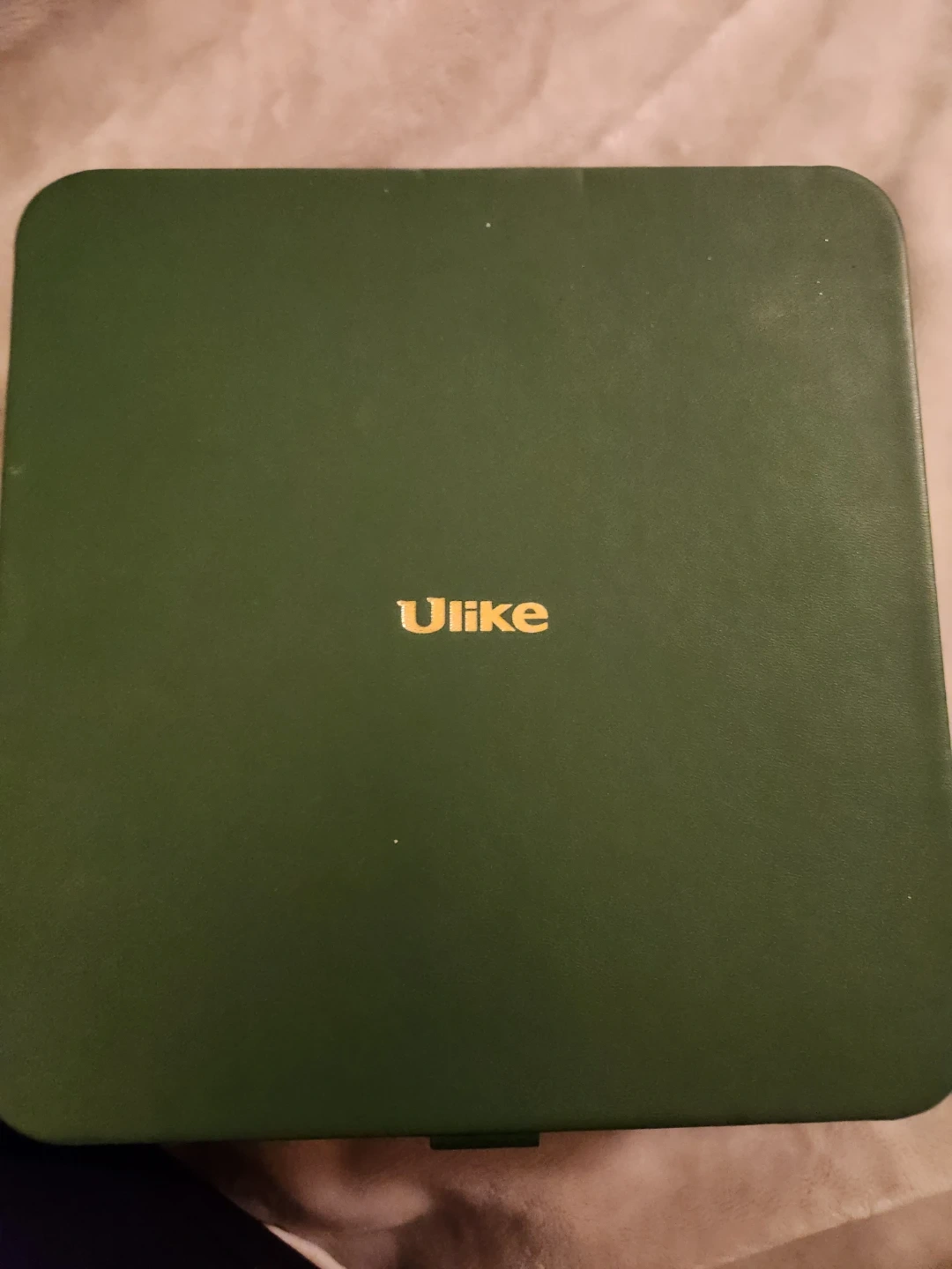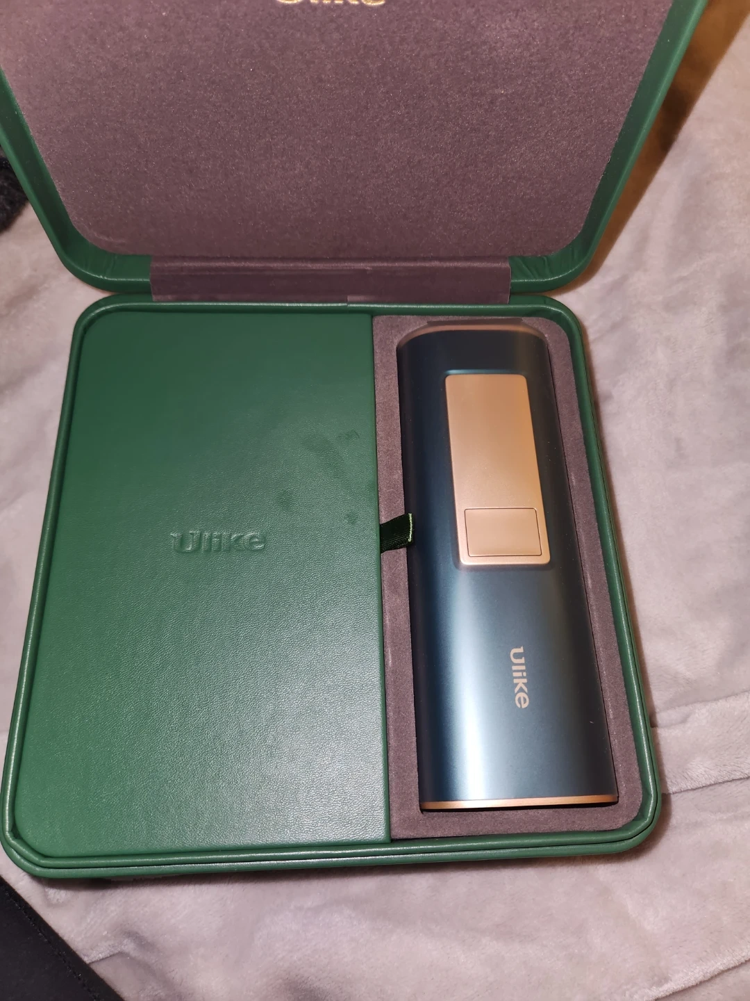 This Ulike hair removal device comes with its original case and charging accessories. It's designed for at-home use. Includes warranty card.