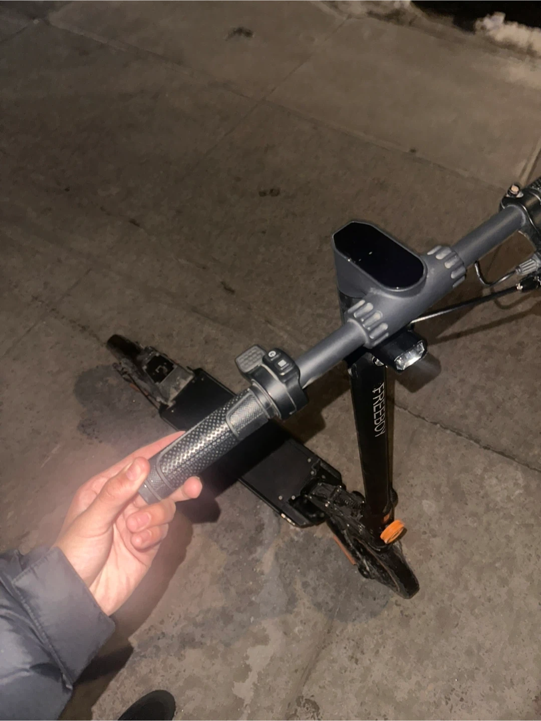 This is a FREEGO electric scooter. It's black and has a sleek design. Great for getting around town! but is missing his battery!
