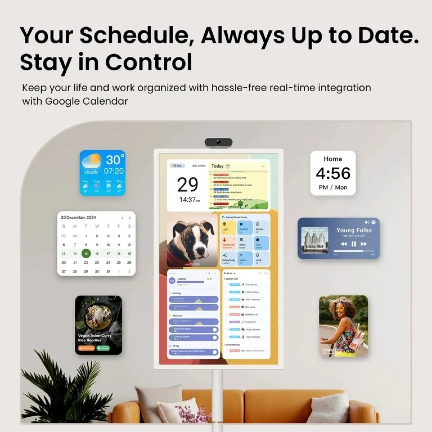Smart Scheduling Tools: Includes customizable calendar widgets and digital screensavers that sync with Google Calendar, Outlook, or Google Tasks for organization.