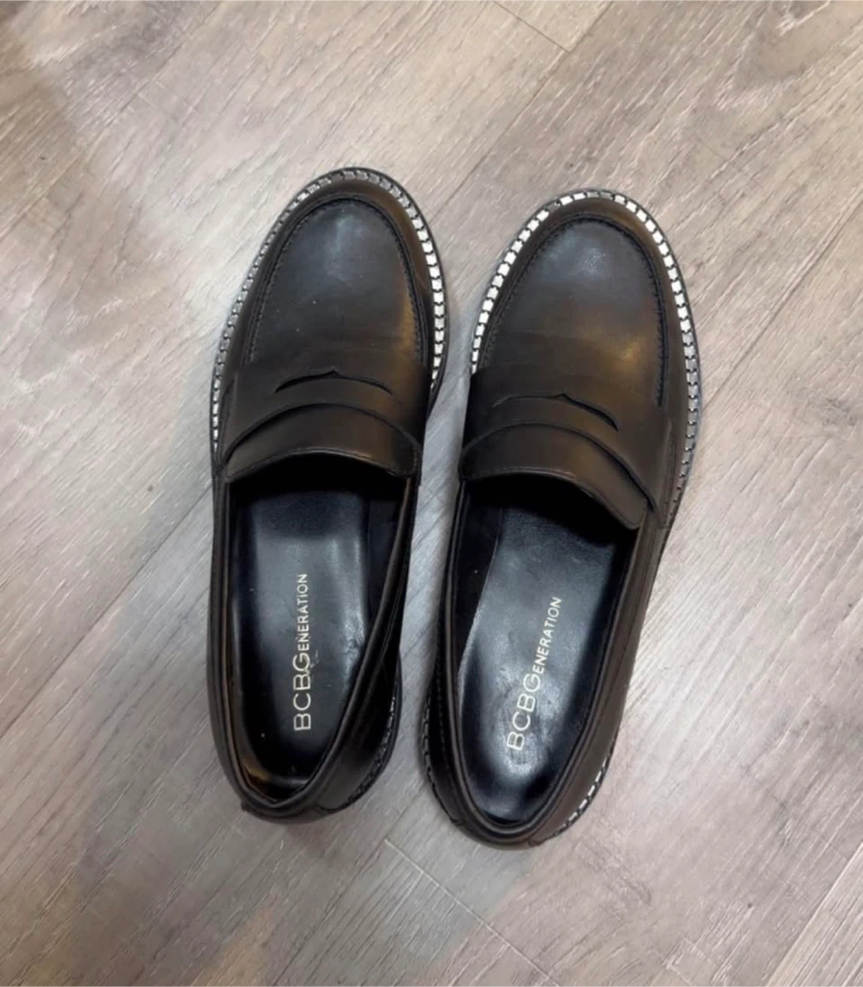 These are BCBGeneration black loafers. They appear to be leather with a decorative silver trim around the sole. Comfortable and stylish for everyday wear.