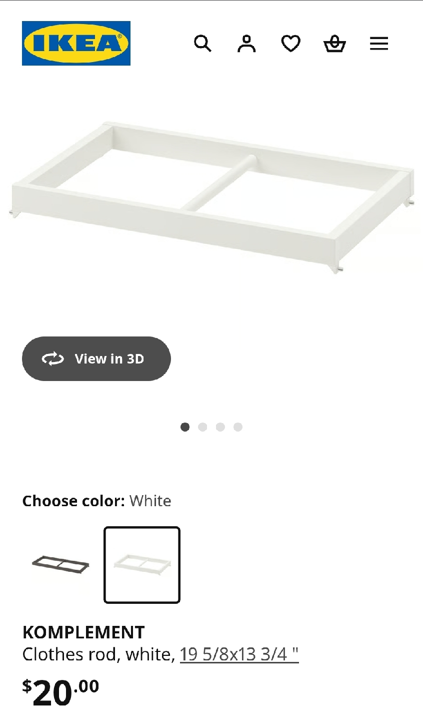 Selling a brand new IKEA KOMPLEMENT clothes rod in white. It's still in the original packaging and includes all the necessary hardware and instructions. The size is 19 5/8x13 3/4".