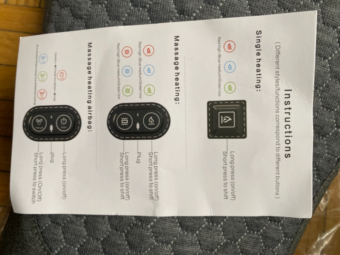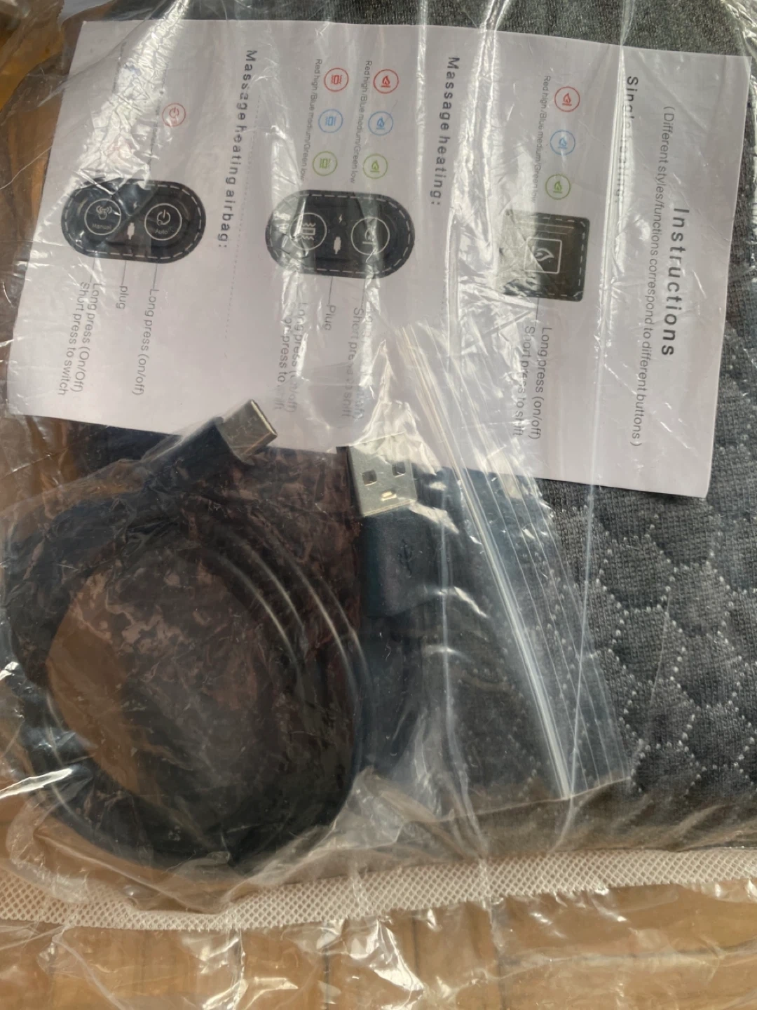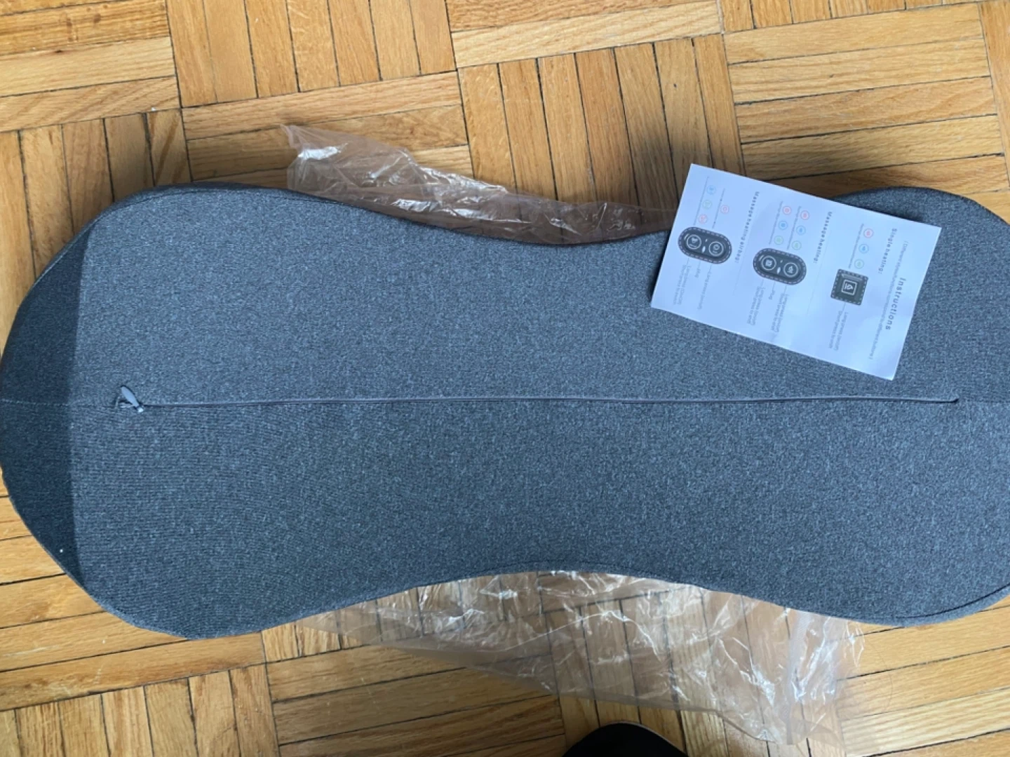 This CoreRelief cushion offers auto and manual massage modes. It includes heating functionality and comes with an instruction manual and charging cable. It's made of soft fabric.