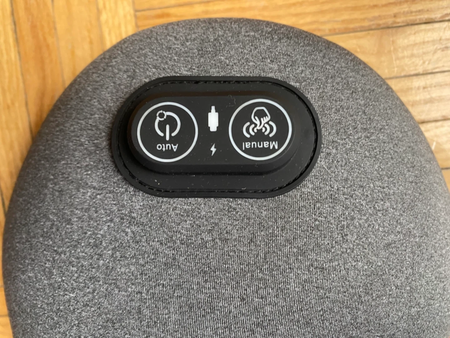 This CoreRelief cushion offers auto and manual massage modes. It includes heating functionality and comes with an instruction manual and charging cable. It's made of soft fabric.