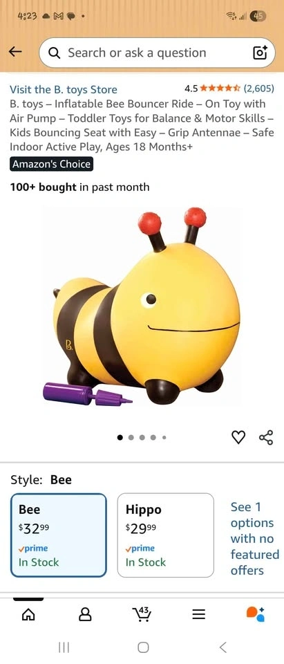 Cute B. toys inflatable bee bouncer. Great ride-on toy for little ones. Helps with balance and motor skills. Super fun for indoor active play. Pick up near Baycrest Park.