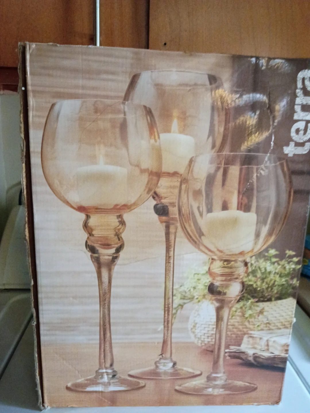 Set of three tall glass candle holders with a warm amber tint. They feature elegant stems and wide bowls, perfect for pillar candles. Includes original packaging.