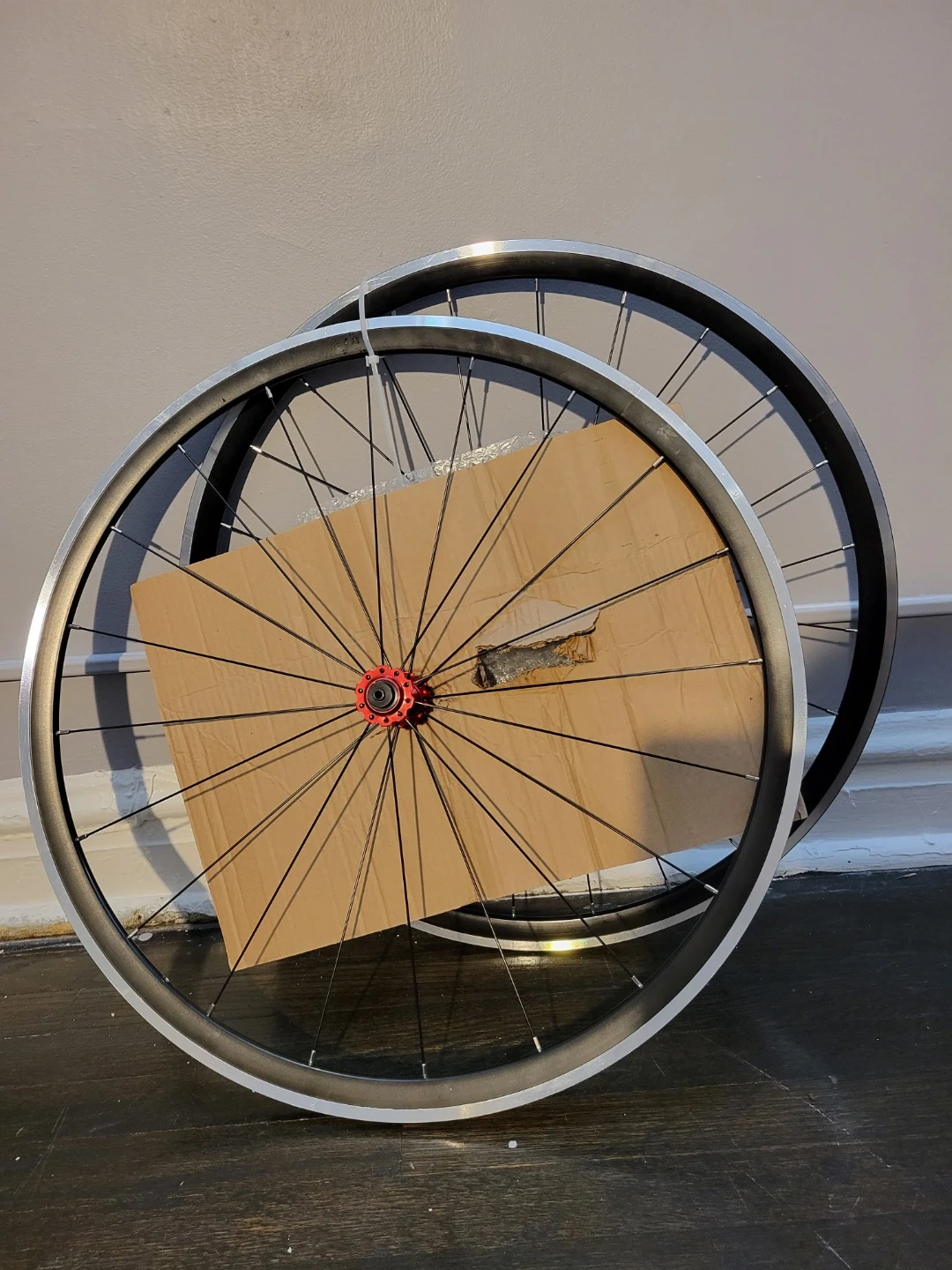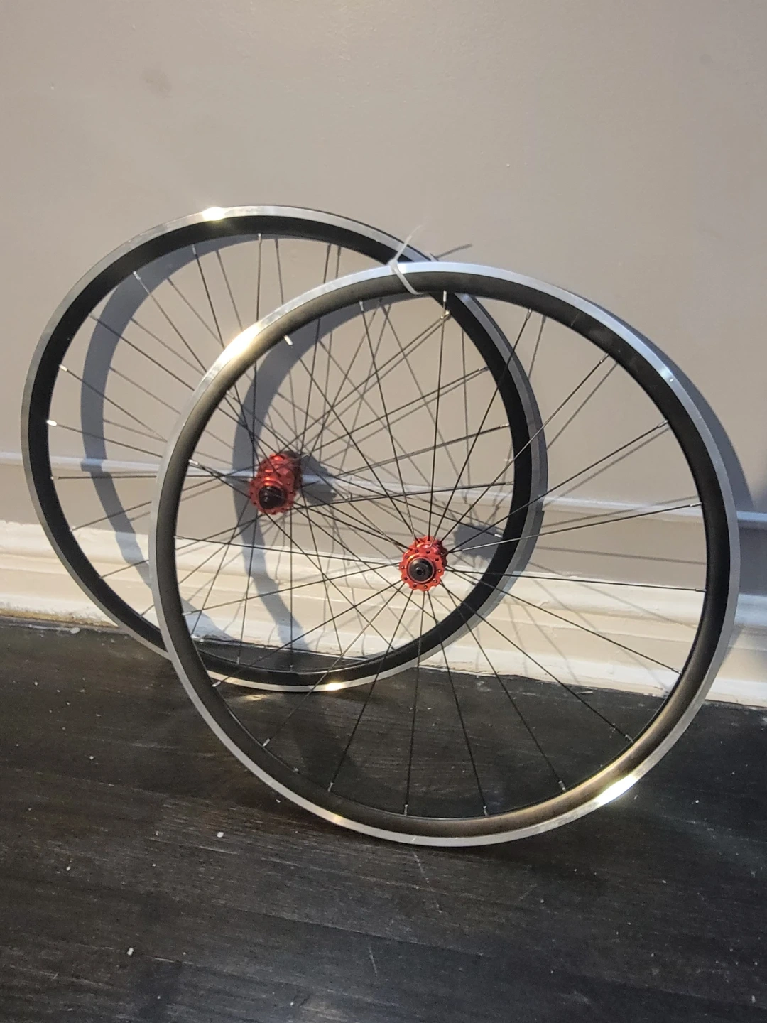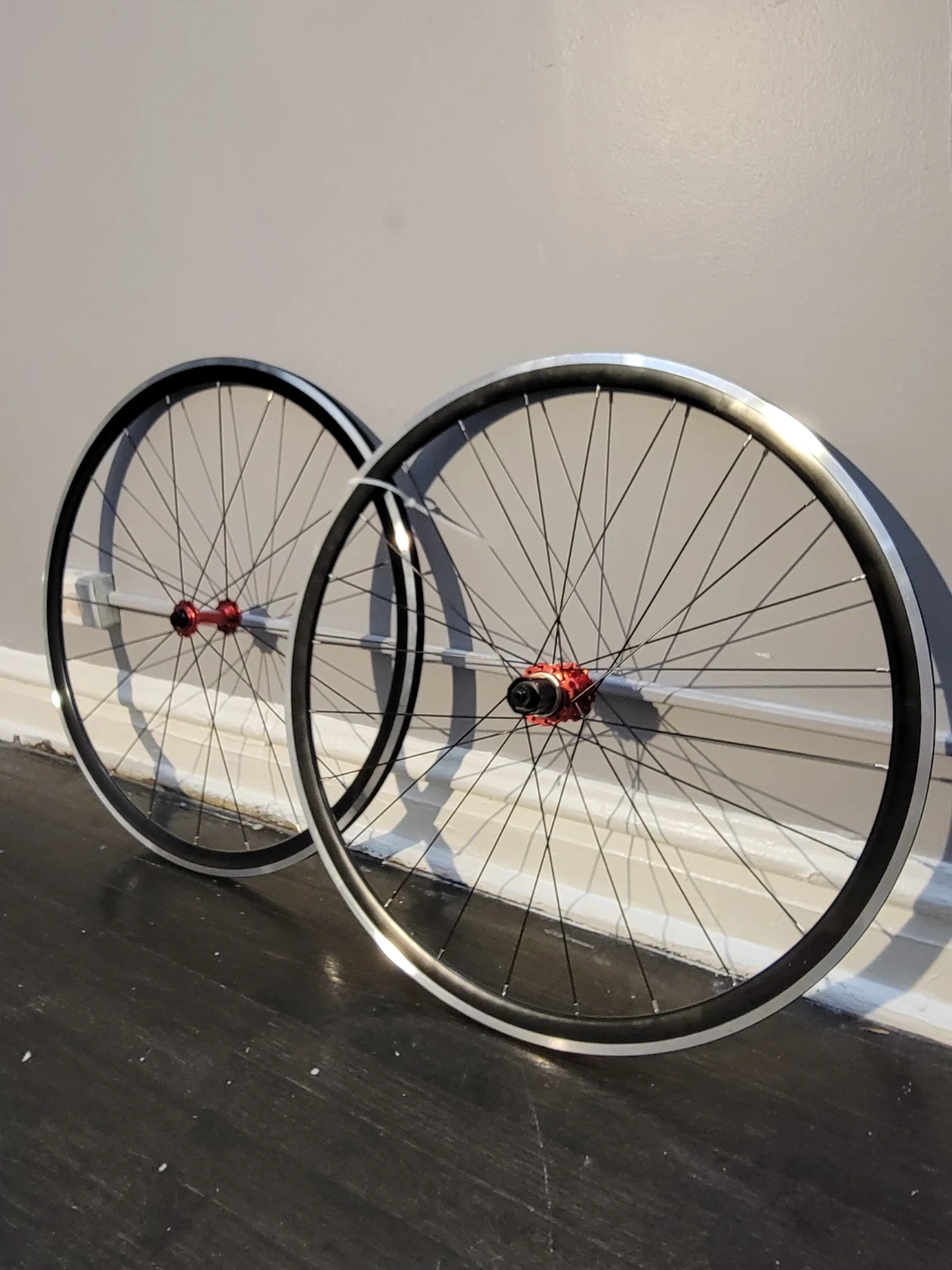 This is a set of 700c road bike wheels. They feature red hubs and black spokes. The rims are silver and black.